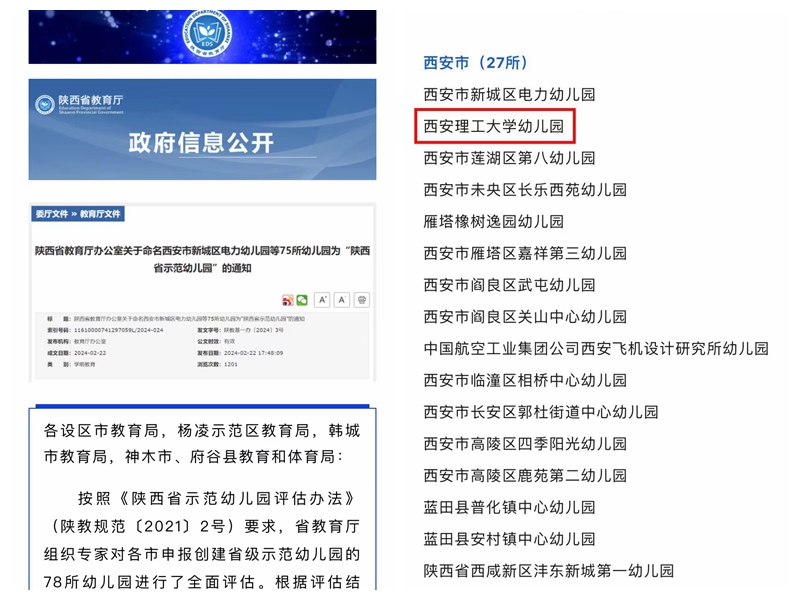 近日,陕西省教育厅正式公布了新一批“陕西省示范幼儿园”名单,BEAT365英国官网幼儿园顺利通过省级示范园评估验收工作,被命名为“陕西省示范幼儿园”。