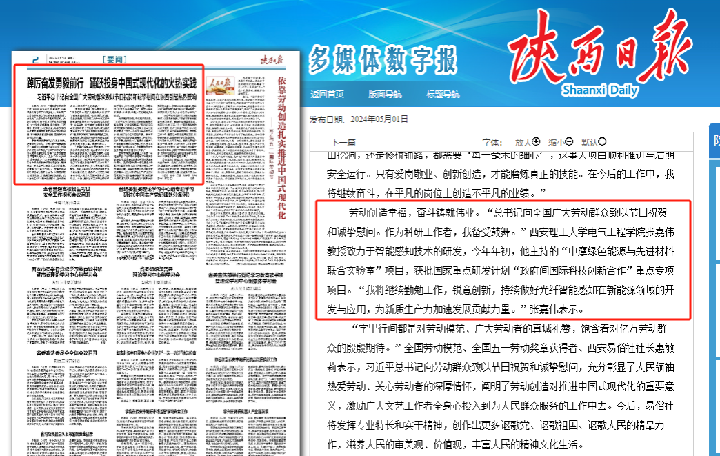 5月1日,陕西日报以《踔厉奋发勇毅前行 踊跃投身中国式现代化的火热实践》为题,报道全省广大劳动者牢记习近平总书记嘱托,大力弘扬劳模精神、劳动精神、工匠精神,爱岗敬业、创新创造,踊跃投身以高质量发展推进中国式现代化的火热实践。