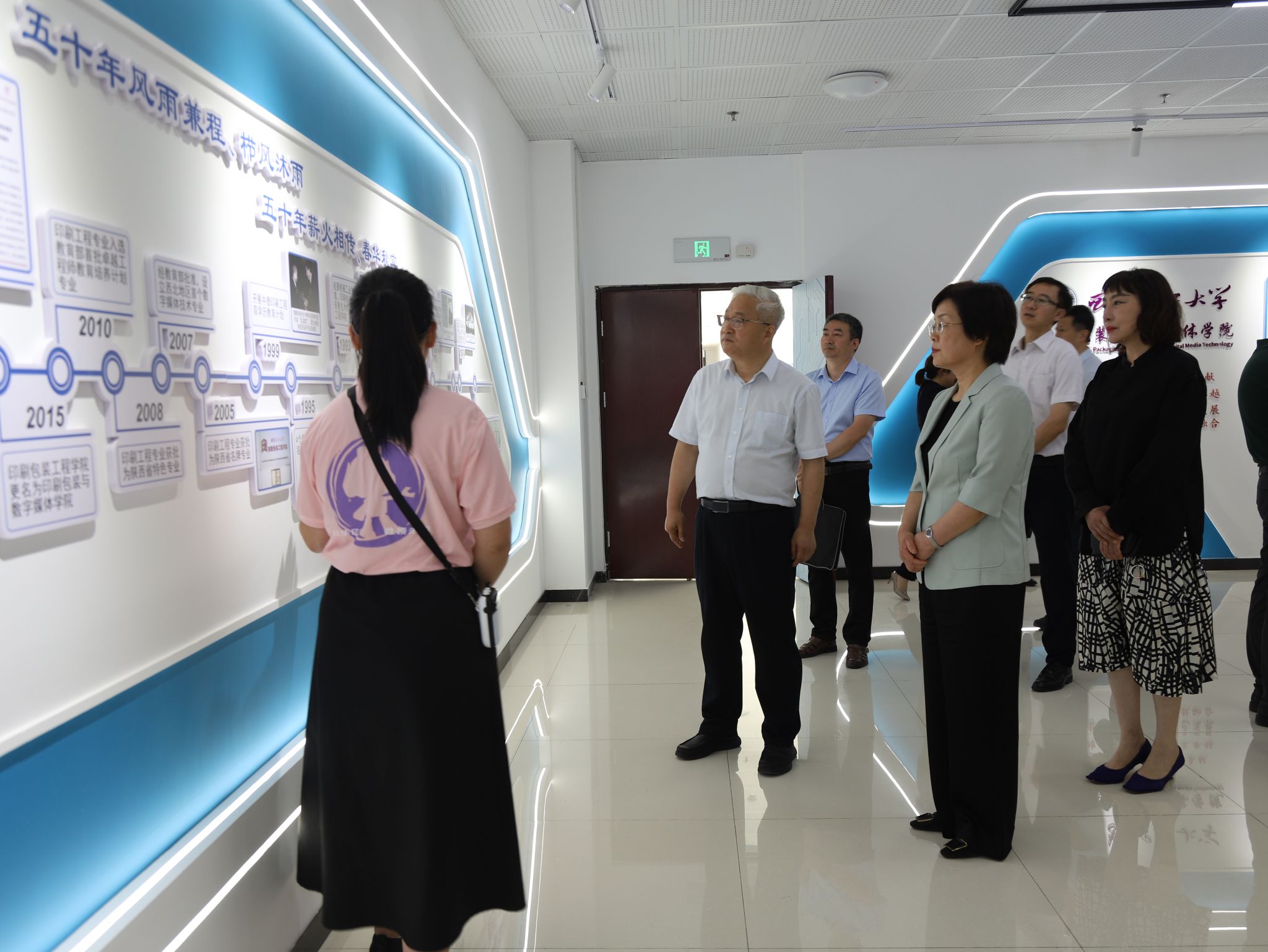会前,李智军陪同王玉娥、董侠先后参观了学校校史馆、印刷包装与数字媒体学院文化墙,了解了学校的历史沿革、办学特色及新时代学校取得的辉煌成绩。