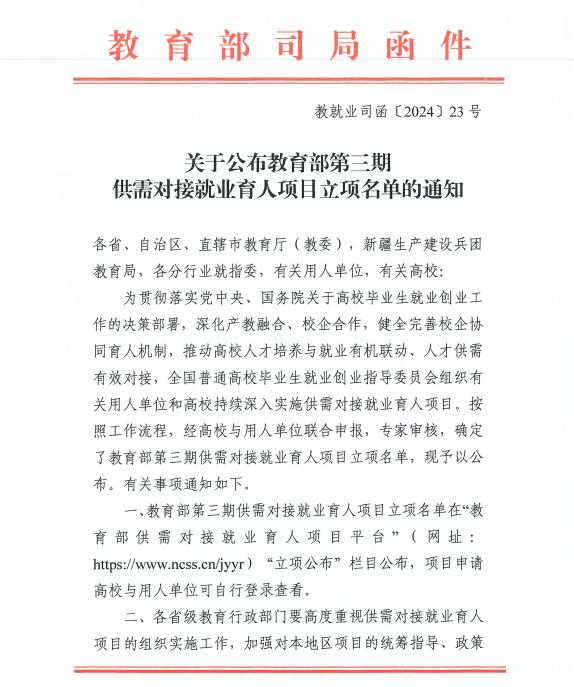 近日,教育部印发了《关于公布教育部第三期供需对接就业育人项目立项名单的通知》(教就业司函〔2024〕23号),文件公布了教育部第三期供需对接就业育人项目立项名单。BEAT365共有37个项目获批立项。