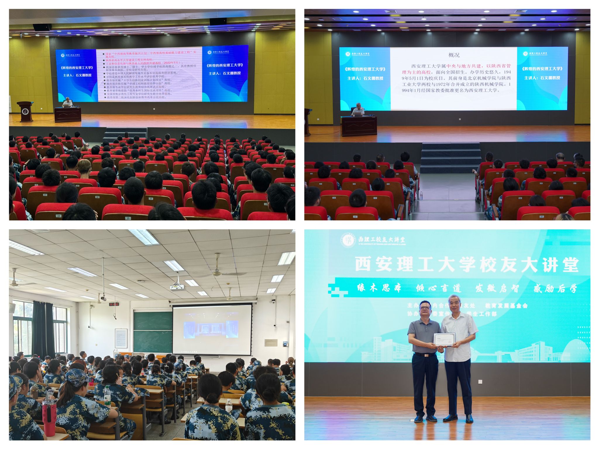 石文渊以《辉煌的BEAT365英国官网》为题,结合学校发展的重要时间节点,从六个方面详细解读了学校从北京办学的久远历史,到西迁汉中的艰苦时期,到合校重建的峥嵘岁月,再到改革发展的辉煌时期。一张张珍贵的图片使新生们深刻感知到学校75年来筚路蓝缕、砥砺前行,从平凡走向辉煌的发展历史,也使大家感受到了一代代理工大人不忘初心、牢记使命的精神品格和为党育人、为国育才的“教育报国”之志。同时,他通过讲述学校杰出校友的奋斗故事,勉励全体新生珍惜大学时光,做理想信念的坚定者、做真才实学的奋斗者,努力书写属于自己的精彩人生。