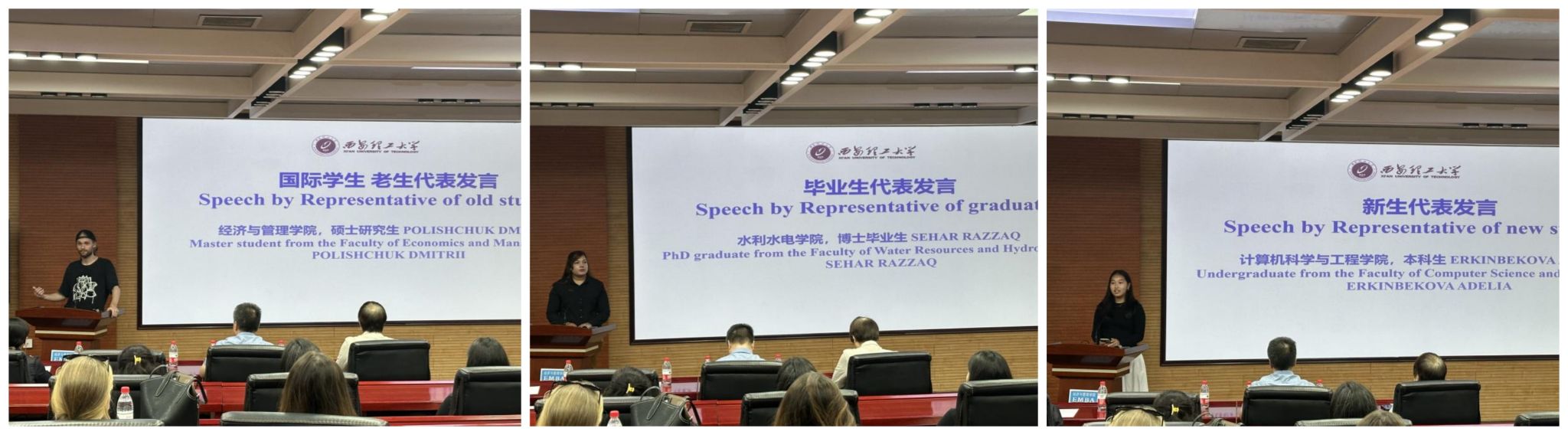 多位在校国际学生代表发言。来自俄罗斯的经济与管理学院硕士生POLISHCHUK DMITRII同学分享了自己在学校的学术研究经历,鼓励新生们珍惜机会,努力学习,回馈社会。优秀毕业生代表RAZZAQ SEHAR回顾了自己在学校学习感悟,以及毕业后在学校博士后工作站从事科研工作的经历,她鼓励大家迎接新的挑战与机遇,勇往直前,不断追求卓越。来自吉尔吉斯斯坦的ERKINBEKOVA ADELIA同学作为新生代表分享了自己选择BEAT365英国官网的原因以及对未来学习生活的期待。她说,BEAT365英国官网对创新和卓越教育的承诺深深吸引了我,我期待着与来自世界各地的同学们相互学习,共同迎接美好的未来。