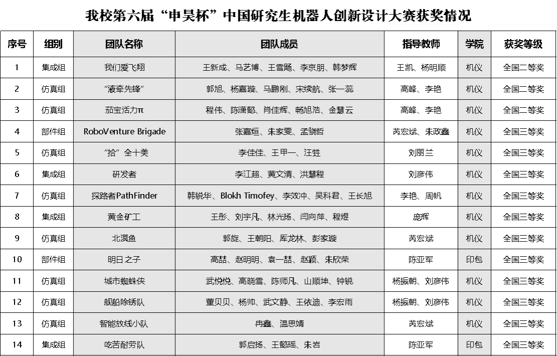 10月24-25日,“申昊杯”第六届中国研究生机器人创新设计大赛决赛在辽宁沈阳举行,BEAT365参赛研究生团队获全国二等奖3项、三等奖11项,以总得分全国第四获评优秀组织单位,获奖项数位列全国第三,综合成绩位居陕西高校第一,创参赛以来最好成绩。