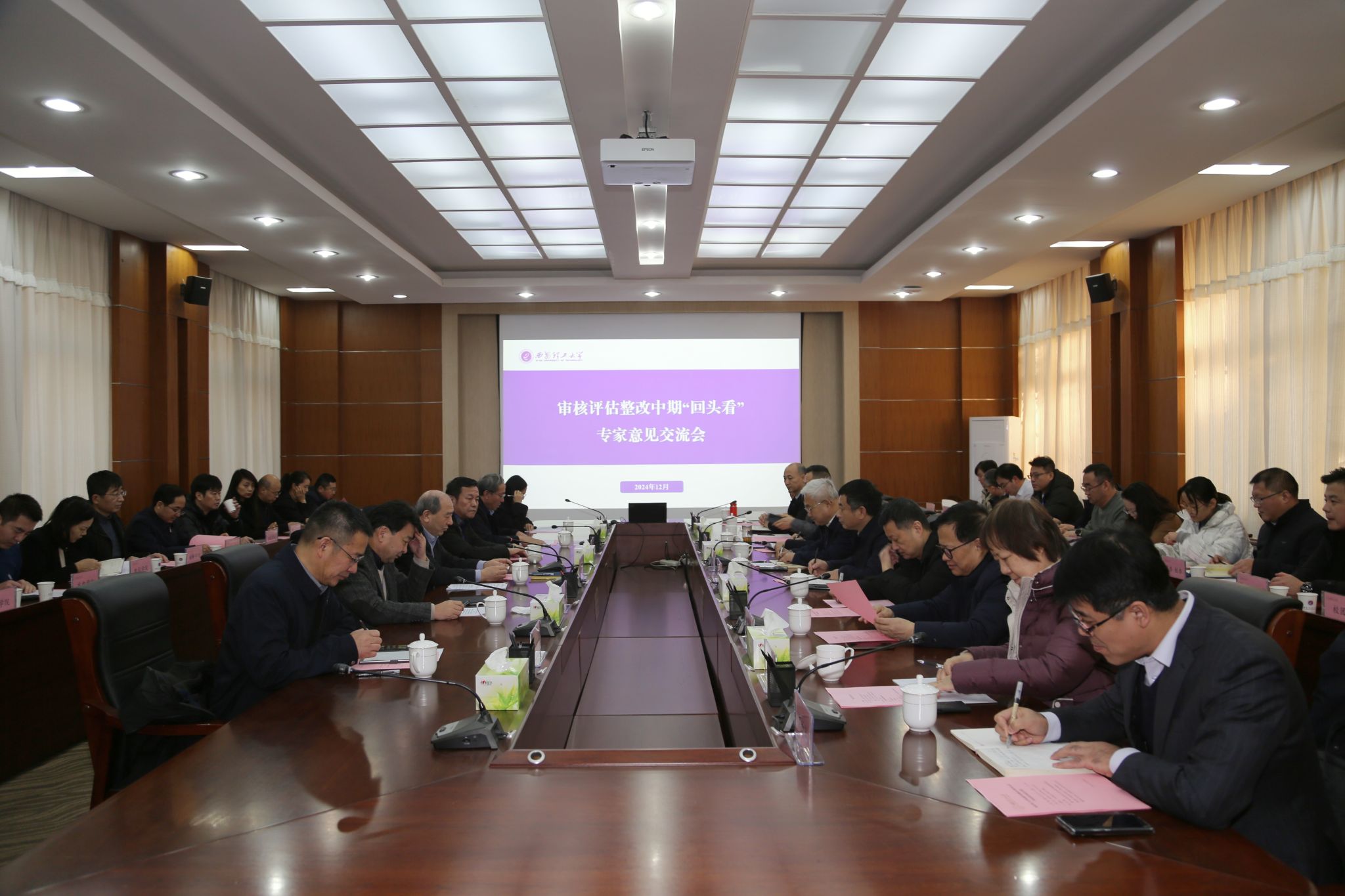 惠泱河主持第二阶段会议。他指出,省教育厅高度重视审核评估整改工作,开展审核评估整改中期“回头看”,不仅是陕西省审核评估“123612”整改工作机制的重要组成部分,更是做好审核评估“下半篇文章”的关键环节。考查过程,专家组将坚持问题导向,以审核评估整改方案为依据,通过对学校整改措施、过程监管、整改落实、整改效果及教育教学改革创新成效等方面深入考查,做出全面客观的评价,并对考查过程发现的问题提出意见建议,助力学校高质量、高水平发展,确保整改工作落到实处,达成预期目标。