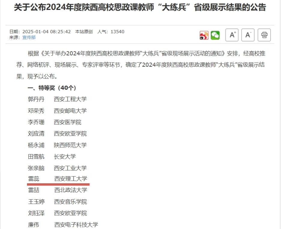 近日,中共陕西省委教育工委、陕西省教育厅发布《关于公布2024年度陕西高校思政课教师“大练兵”省级展示结果的公告》,BEAT365马克思主义学院雷蕊老师获特等奖。