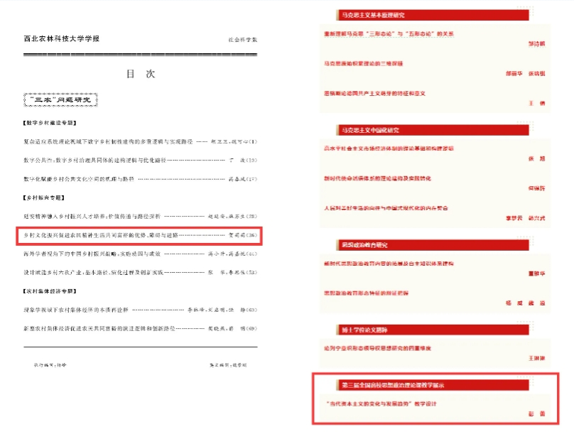 科研工作成效不断显现。寒假期间,学院教师积极申报各类科研项目。鲁宽民、史向军、彭蕾各申报获批省哲学社会科学专项一项。张晓艳、包莹、郭军获批省社科联“三农”专项重大课题1项,思政专项2项。鲁君、乔夏阳、彭蕾、徐瑞娇获批省教育厅项目4项。在成果产出方面,彭蕾教授、博士生贺莉莉和郝丹梅老师分别在《马克思主义理论学科研究》《西北农林科技大学学报(社会科学版)》《陕西日报》等核心刊物上发表高水平论文。