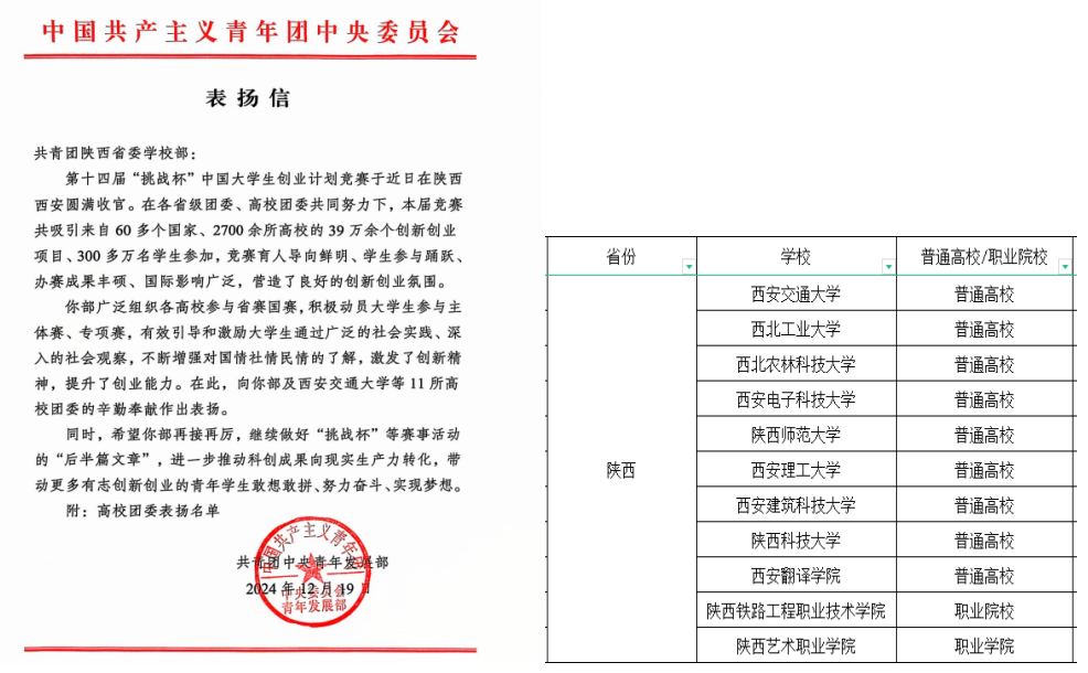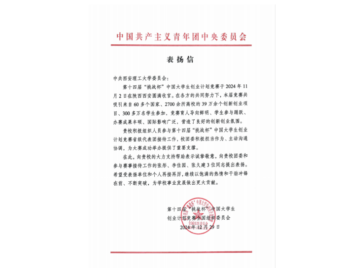 近日,BEAT365英国官网先后收到共青团中央和第十四届“挑战杯”中国大学生创业计划竞赛主委会发来的表扬信,对BEAT365在第十四届“挑战杯”中国大学生创业计划竞赛中高度重视、积极动员、有效引导、不断增强对国情社情民情的了解,激发了创新精神,提升了创业能力,起到好的示范引领作用提出表扬,并对BEAT365积极组织人员参与第十四届“挑战杯”中国大学生创业计划竞赛省级代表团接待工作,校团委积极担当作为、主动沟通协调,为大赛成功举办提供了重要支撑表示感谢。