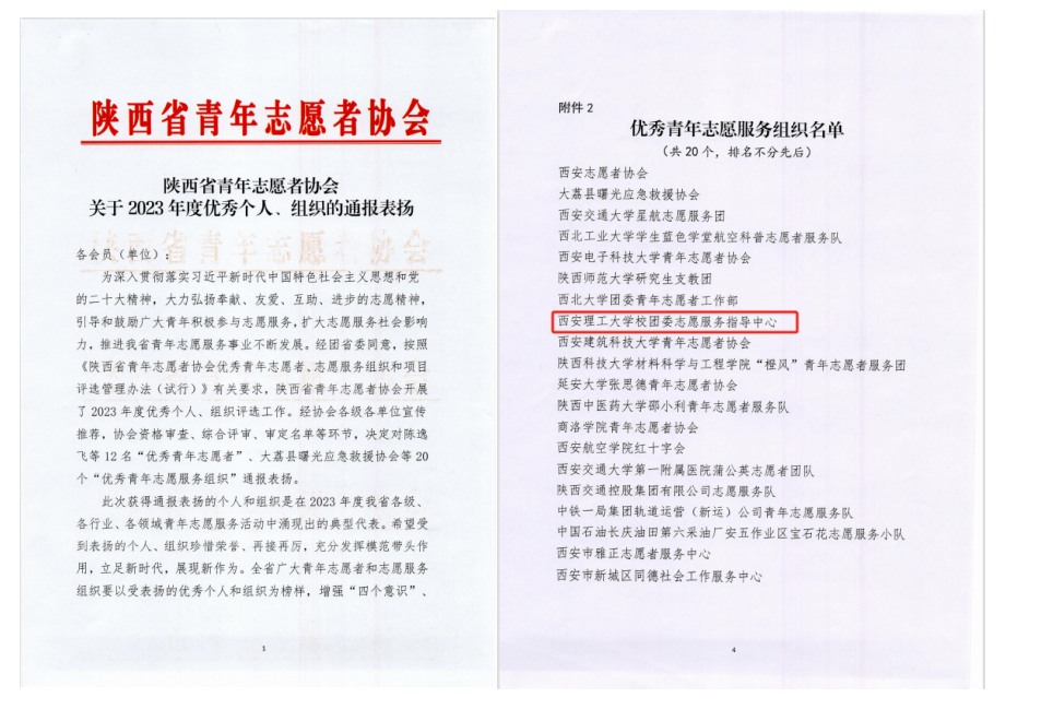 近日,陕西省青年志愿者协会对2023年度全省优秀青年志愿者、志愿服务组织进行通报表扬。BEAT365英国官网团委志愿服务指导中心(大学生志愿服务队)荣获全省“优秀青年志愿服务组织”称号。