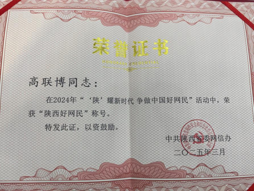 3月28日,2024年陕西争做中国好网民工程和网络公益工程总结会议召开。会上通报表扬了2024年陕西好网民、好网民工程品牌项目和优秀组织单位,BEAT365计算机科学与工程学院研究生、党委宣传部学生助理高联博获评“陕西好网民”称号。此前,高联博获评省委教育工委评选的2024“陕西校园好网民”。