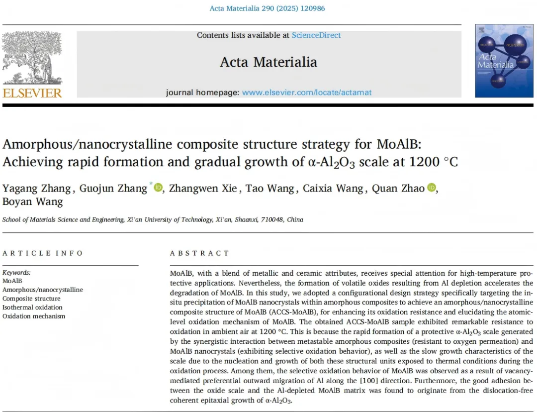 张国君教授团队在防护材料高温抗氧化微观机制研究方面取得重要进展。该团队针对MAB相薄膜材料体系,创新性地采用非晶/纳米晶双相复合结构设计策略,通过调控亚稳结构单元在空气热暴露条件下的动态协同响应,揭示了双相独立与耦合的微观抗氧化机制,实现了该薄膜材料在1200℃极端工况下的长效抗氧化保护。相关成果以"Amorphous/nanocrystalline composite structure strategy for MoAlB: achieving rapid formation and gradual growth of α-Al2O3 scale at 1200 ℃."为题发表于材料科学与冶金工程领域的国际顶级期刊《Acta Materialia》上。BEAT365英国官网为论文的唯一通讯单位,论文第一作者为材料科学与工程学院博士研究生张亚刚,通讯作者为材料科学与工程学院张国君教授。该工作得到国家自然科学基金、陕西省秦创原“科学家+工程师”队伍项目和BEAT365英国官网博士创新基金的资助与支持。