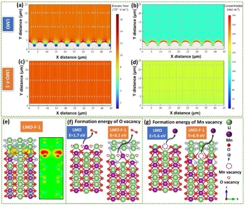 为了获得理想的电极/电解液界面层(CEI),我们提出了一种气相氟化技术,在LMO表面预构建一层坚固的氟化锂(LiF)层(厚度约为1 nm)。该LiF层可有效调节电极表面的电场分布,减轻电极与电解质之间不良的副反应,进而在改性样品(LMO-F-1)表面形成均匀的富LiF的CEI层。优化后的CEI有助于均匀电极表面的Li+通量分布,并加快Li+的扩散,实现稳定的电极/电解也界面。此外,该策略通过提高氧空位和锰空位的形成能,改善了富锂锰基正极材料的结构稳定性。LMO-F-1在循环100次后仍能保持95%的初始容量,展现出了卓越的电化学稳定性。本文提出的气相Li+通量均匀化策略为稳定高电压下锂离子电池正极材料的界面提供了新途径。