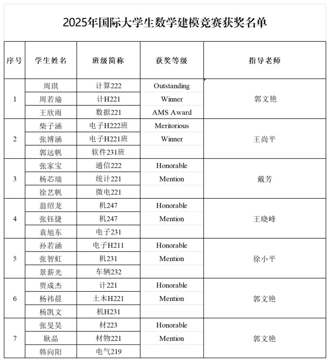 获得AMS冠名奖的团队由理学院2022级信息与计算科学专业本科生周琪、理学院2022级数据科学与大数据技术专业本科生王欣雨、国际工学院2022级计算机科学与技术专业本科生周若瑜组成,他们在指导老师郭文艳精心指导下,选择了一道涉及复杂系统优化与决策分析的赛题。面对高强度、高难度的竞赛要求,团队成员分工协作,充分发挥各自在数学建模、算法设计和英文写作方面的专长,最终提交的论文因"模型创新性、理论严谨性和实际应用价值突出"而获得评委高度评价。