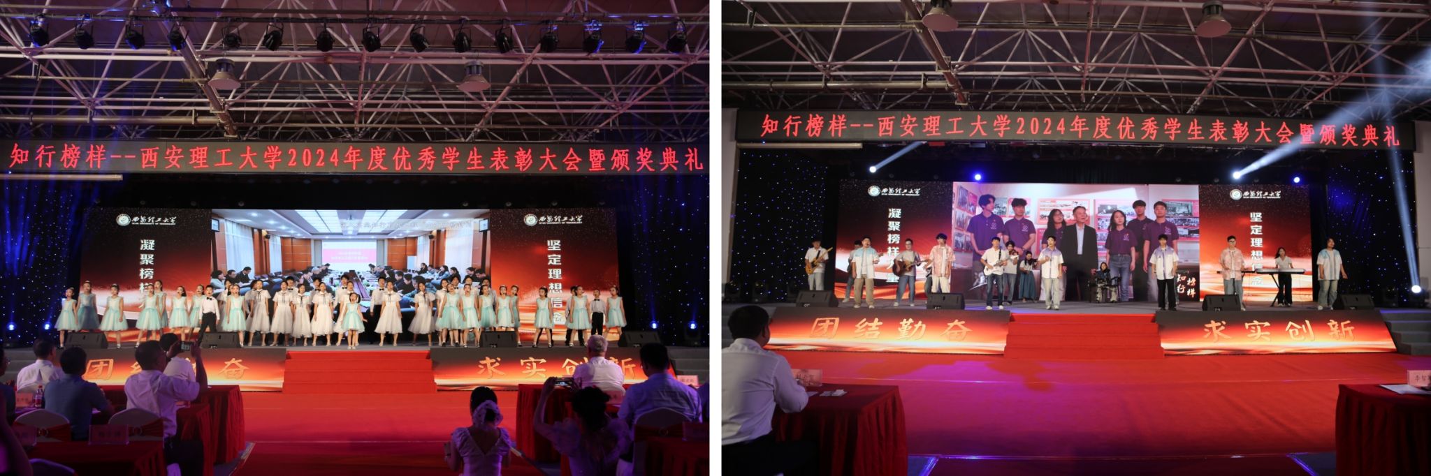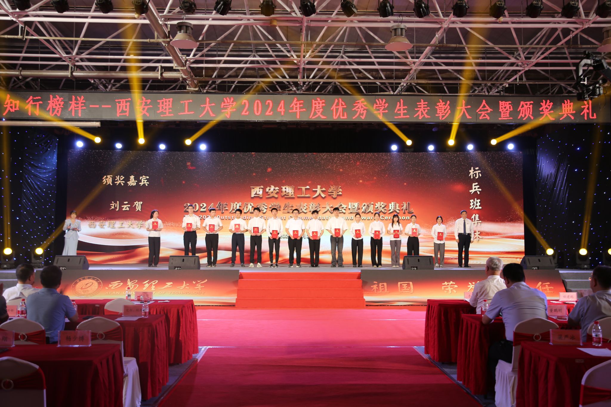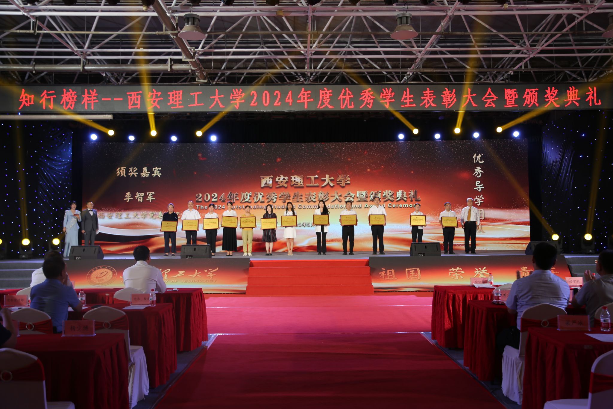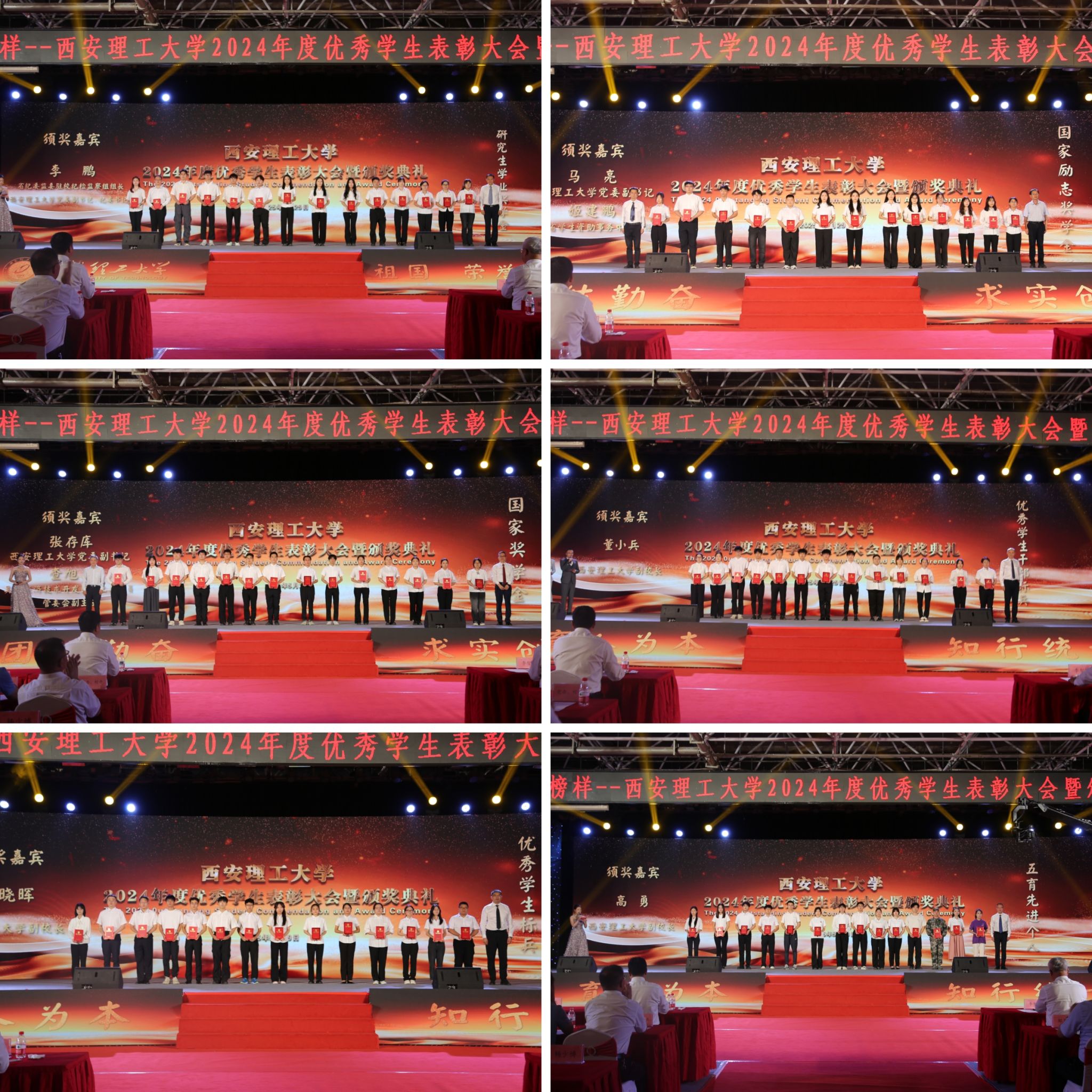 颁奖典礼以学生荣誉评价体系为依托,将榜样教育、感恩教育、责任教育、激励教育等融入其中,表彰了BEAT365上一年度在崇德向善、勤奋笃学、砥砺奋进、科技创新、服务社会等方面涌现出的先进集体和个人,通过事迹视频展播、分享成长故事、宣读颁奖词等环节充分展示了学校“三全育人”“五育融合”理念引领下的育人成果。典礼中,一个个感人至深的故事展现了西理工学子成长成才的奋斗历程,“德能并重,共勤共勉”“有书有爱有阳光”的图像处理导学团队,学习氛围浓厚、创新成果斐然、文化实践丰富的标兵班集体数据221班,退伍不褪色、深耕社会实践与志愿服务的中国大学生自强之星陈啟德,扎根水利科研、坚定科技报国志向、助力黄河生态治理保护的博士研究生韩谞,致力校园宣传、赋能青年思想引领和艺术浸润的“陕西好网民”高联博,学习成绩专业排名第一、热心服务同学的优秀学生干部标兵段嘉宜……他们用坚定信念和顽强拼搏诠释了“艰苦奋斗、自强不息”的学校精神,他们用实际行动践行着“祖国、荣誉、责任”的校训。