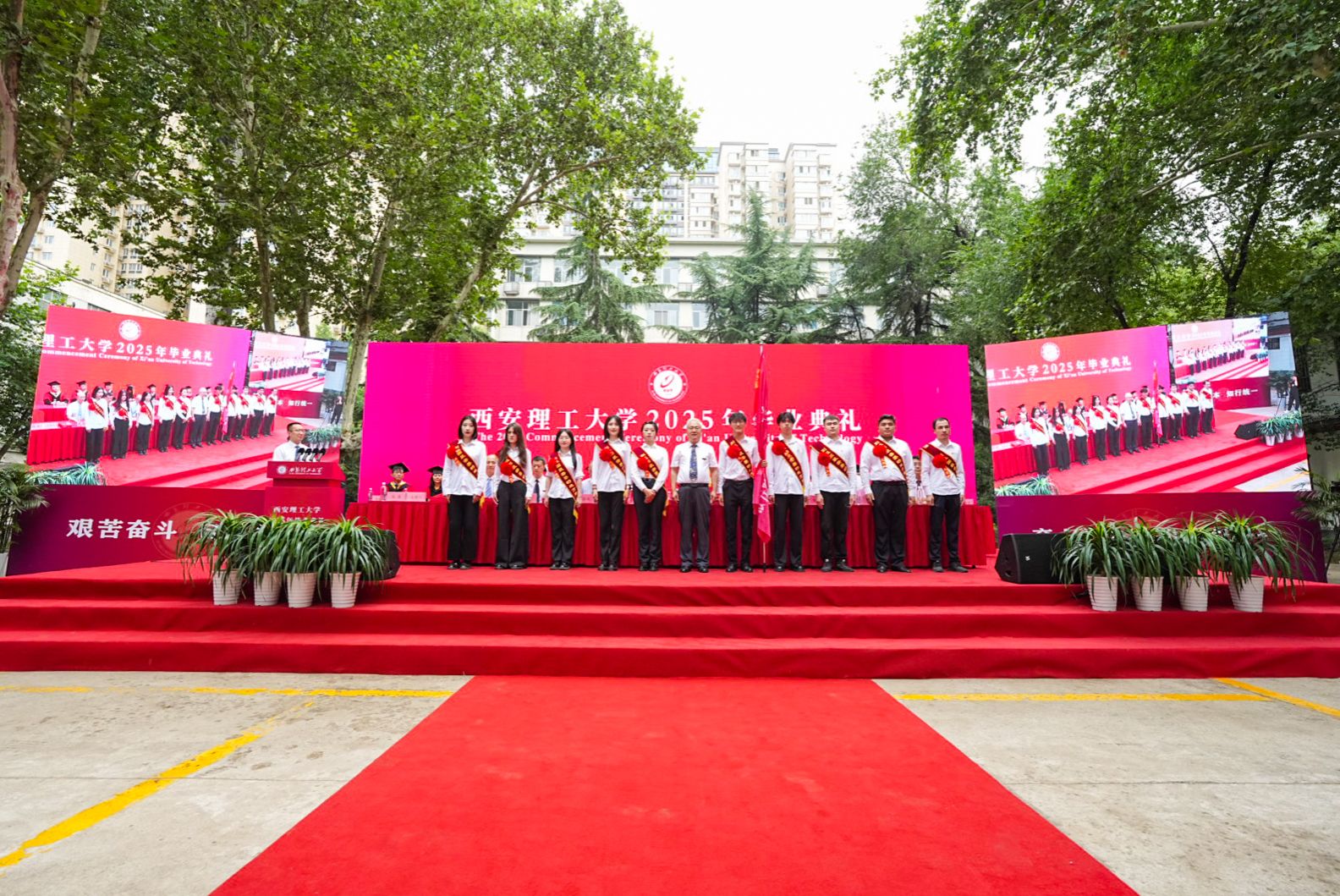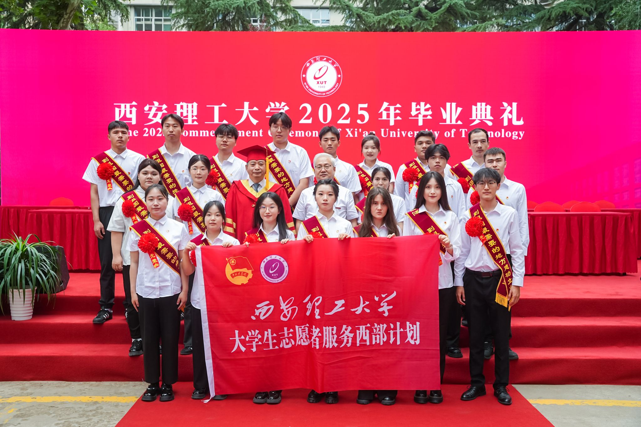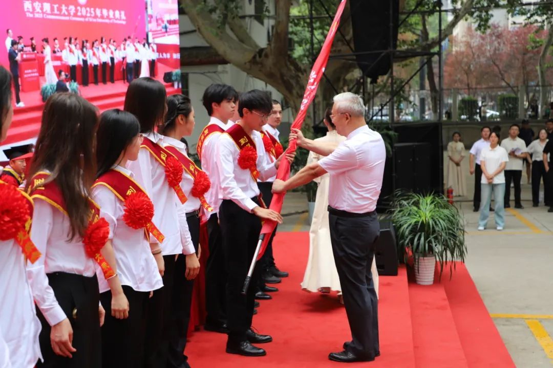 毕业典礼上,黑新宏宣读《2025届研究生毕业决定》《2025届本科生毕业决定》,张存库宣读《关于表彰2025年赴基层、藏疆地区就业毕业生的决定》,与会领导为2025届毕业生代表颁发毕业证书、学位证书,李智军为赴基层、藏疆地区就业学生代表颁发“就业先锋”证书,为“西部计划”志愿者代表授旗,张晓晖宣读《2025届毕业生校友联络员聘任决定》,与会领导为2025届毕业生校友联络员颁发聘书。