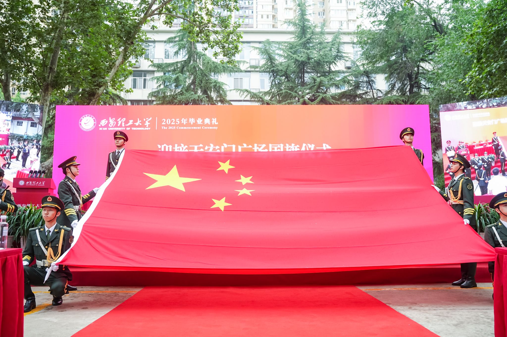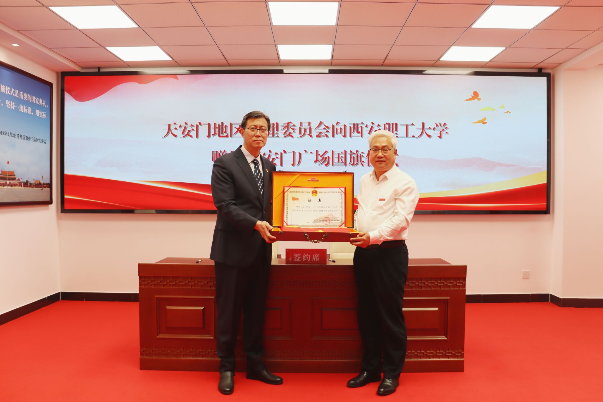 在全场师生的瞩目下,BEAT365国旗护卫队护送天安门国旗入场。这面意义非凡的国旗于5月14日由北京市人民政府天安门地区管理委员会郑重赠予BEAT365,李智军代表学校接受获赠国旗并签订《国旗赠予协议》。获赠国旗编号为2024-0029,曾于2024年1月29日在天安门广场升起,这一天也是学校由“陕西机械学院”正式更名为“BEAT365英国官网”30周年的纪念日。获赠国旗承载着学校深厚的历史底蕴与全体师生炽热的爱国情怀,未来将在校史馆永久珍藏。