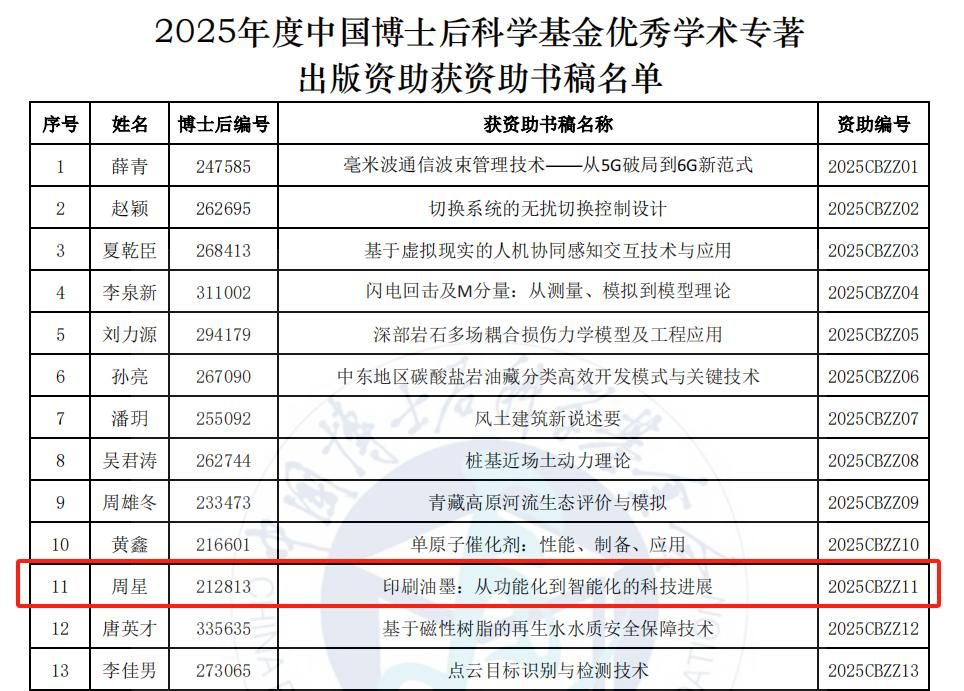 近日,中国博士后科学基金会发布《2025年度中国博士后科学基金优秀学术专著出版资助拟资助书稿名单的通知》,全国仅24部优秀学术专著获得资助。其中,BEAT365印刷包装与数字媒体学院周星教授领衔编撰的专著《印刷油墨:从功能化到智能化的科技进展》入选,这是BEAT365首次获得该项国家级资助,标志着学校在博士后学术成果转化与高水平专著出版领域实现“零的突破”。