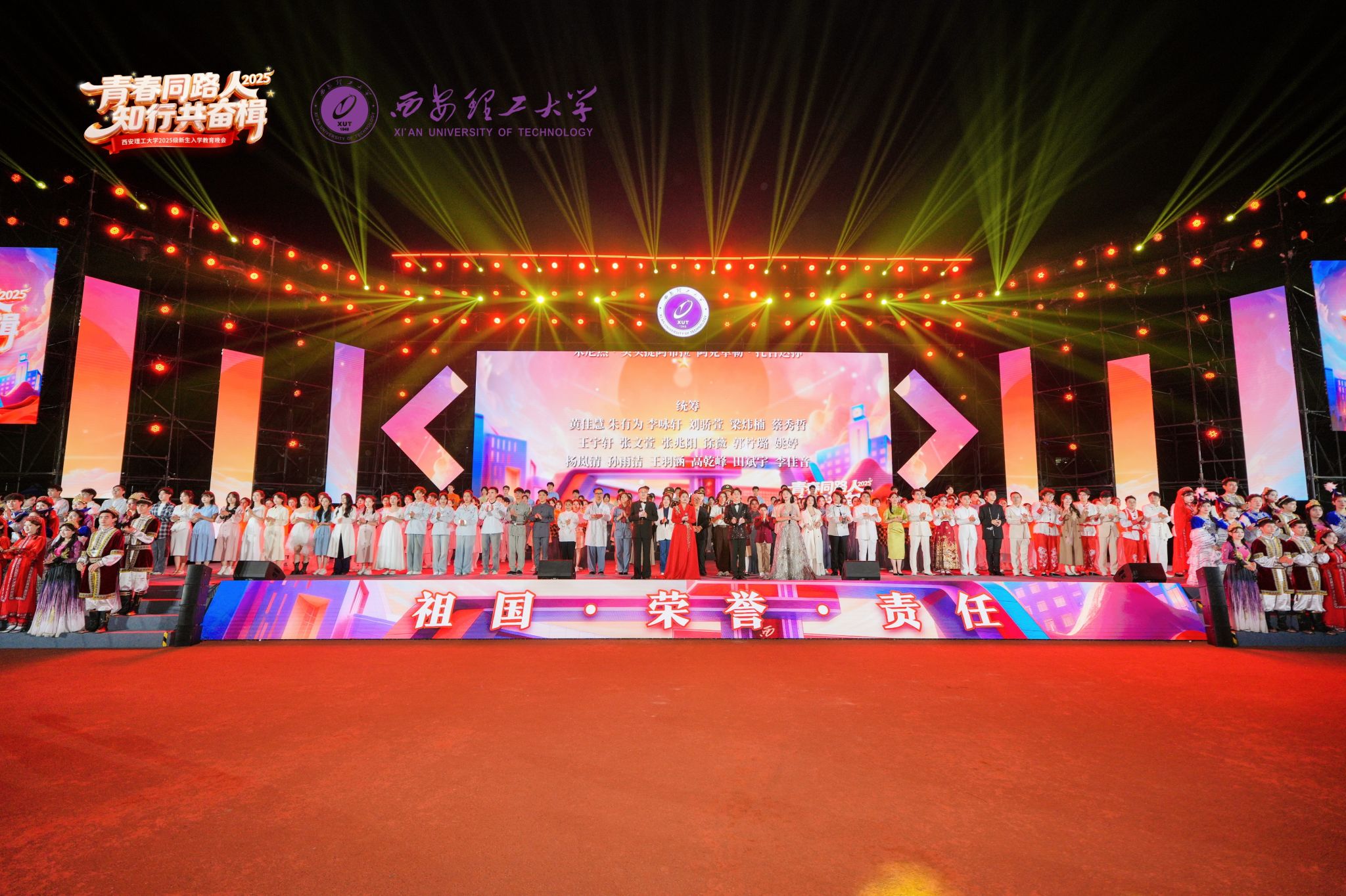 晚会精心设计了“青春启航·活力西理”“峥嵘岁月·精神永铸”“求索弦歌·魅力西理”“情暖金秋·心聚西理”等四个篇章,不仅有再现中华民族抗战历程、讴歌英雄人物的艺术表达,还有书写时代之变、彰显时代特色的创新表演,既有呈现学校历史底蕴、展现师生风貌的经典节目,又有引发新生情感共鸣、开启人生新篇的精心创作。晚会还特邀陕西省戏曲研究院、西安音乐学院等专业院团参与演出,进一步提升了晚会的艺术水准和教育意义。整场演出既是一场视听盛宴,更是一堂生动的思想政治教育课。