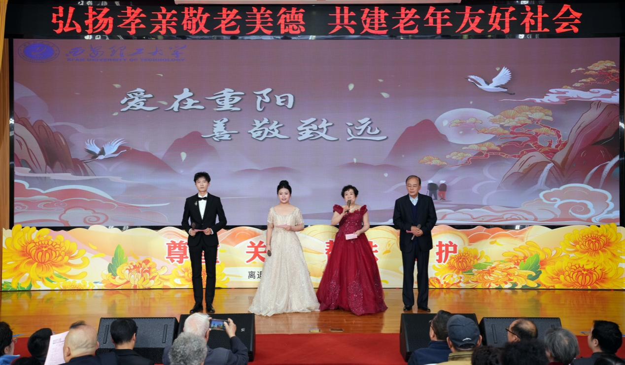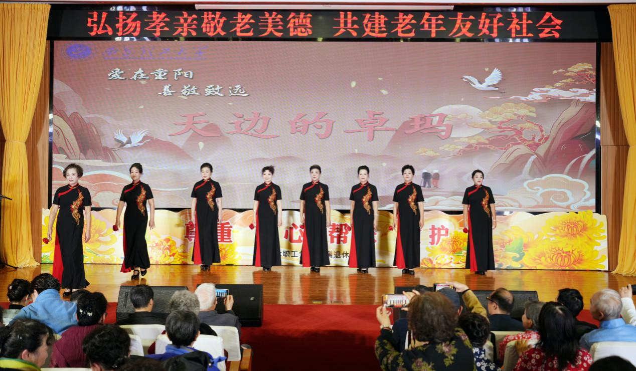 金桂飘香漫重阳,浓情关怀送安康。为弘扬中华民族尊老、敬老、爱老、助老的传统美德,在重阳节来临之际,10月23日下午,离退休职工党委、离退休工作处在金花图书馆报告厅举办了“爱在重阳 善敬致远”离退休教职工重阳节文艺联欢会。校党委副书记张存库,省教育厅离退处调研员相俊生、耿利明老师,陕西师范大学离退处副处长崔创,西安建筑科技大学离退休党委副书记张俏出席活动。