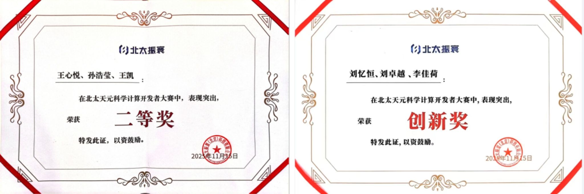 在刚刚落幕的2025年北太天元科学计算开发者大赛中, BEAT36524级本科生王心悦、孙浩莹、王凯荣获二等奖,23级本科生刘忆恒、刘卓越、李佳荷斩获创新奖。获奖团队于11月15日在北京参加了颁奖典礼。