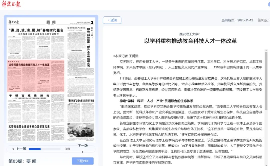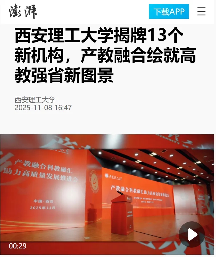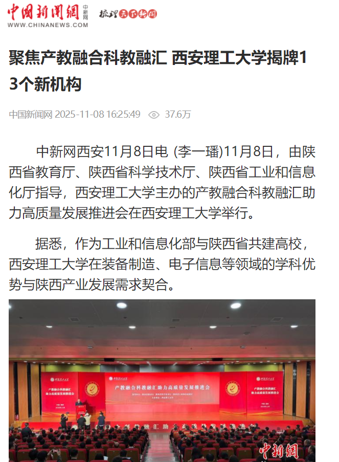 从“理论学习—工程实践—创新研发”的螺旋式培养模式,到“一人一企一策”的校企协同机制;从2025年上半年250件发明专利授权量的硬核实力,到多项专利作价落地的转化成效,西理工正以“学科—科研—人才—产业”贯通融合的生态体系,破解传统学科壁垒,激活创新发展动能。多家媒体的持续聚焦,既是对学校改革实践的认可,更是对西理“双一流”建设的鞭策。