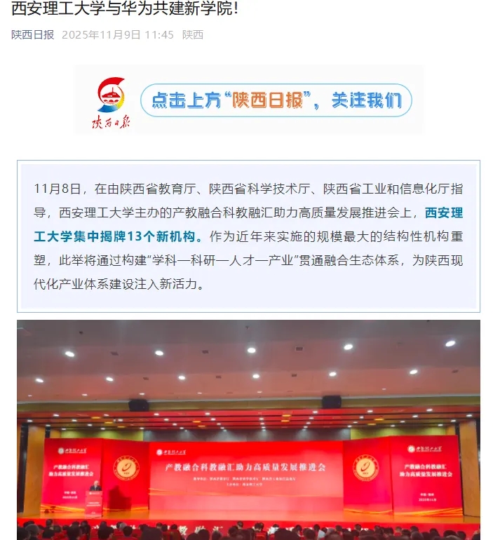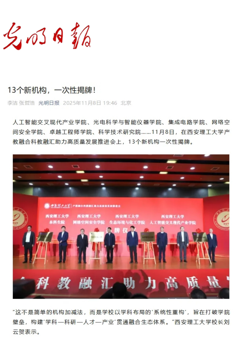 这不是一次简单的院系重组,而是一场立足国家战略、服务陕西发展的主动突围,更是西理工以学科系统性重构破解发展难题的坚定实践。13个新机构的诞生,核心是打破学科壁垒、打通融合堵点,构建“学科—科研—人才—产业” 贯通融合的生态体系,让优质资源向核心领域、关键赛道集聚:科学技术研究院搭建跨学科协同平台,为承接重大工程、产出重磅成果筑牢支撑;与华为共建的人工智能交叉现代产业学院,深度融合华为在大模型、鸿蒙生态等关键领域的全栈技术优势,攻坚“卡脖子”难题;生态环境与化工学院、光电科学与智能仪器学院等精准对接黄河流域生态保护、高端装备制造等国家战略需求,紧扣区域产业链痛点;卓越工程师学院整合280余个校内外实践基地,以“一人一企一策” 模式强化校企协同育人,让学子在一线练就真本领;未来技术学院破传统育创新人才,为“双一流”赋能,铸未来技术领军者培养策源地……