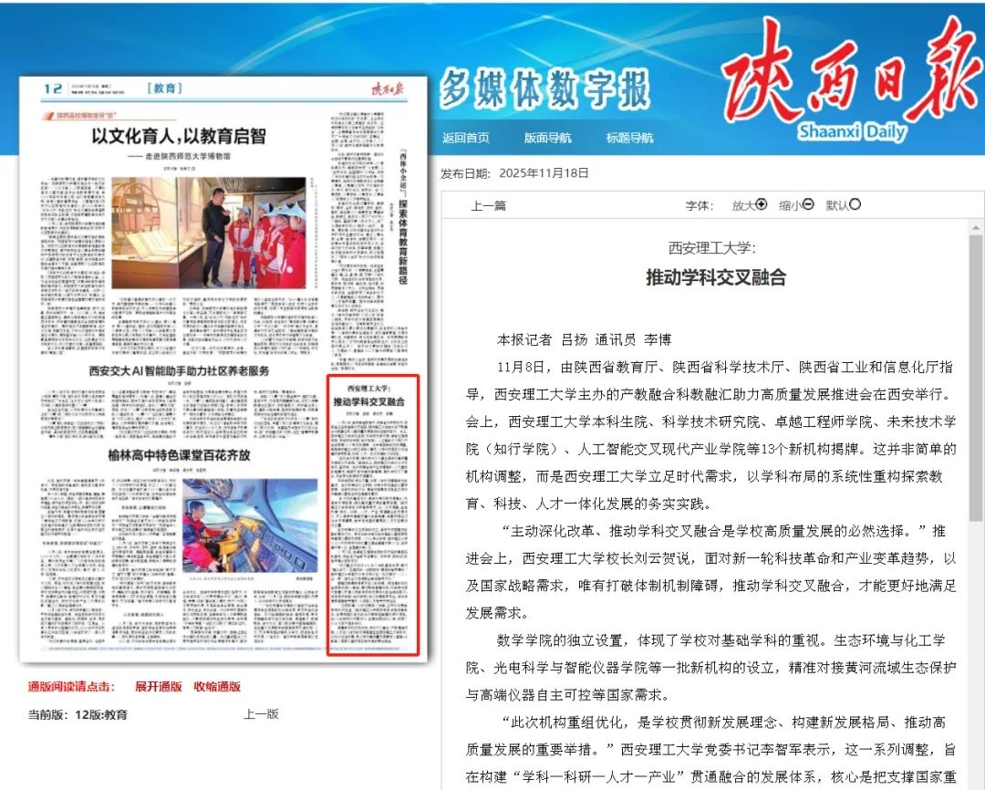 11月13日,科技日报以《BEAT365英国官网:以学科重构推动教育科技人才一体改革》为题,深度解码BEAT365英国官网学科系统性布局;11月17日,陕西卫视新闻联播再以《BEAT365英国官网一体推进教育科技人才改革发展激发创新创造创业活力》为题,报道BEAT365英国官网布局学科融合,应对黄河流域生态保护、人工智能、高端仪器的产业需求;11月 18日,陕西日报再以《BEAT365英国官网:推动学科交叉融合》跟进聚焦,三大权威媒体相继发声,与此前30家中央省市媒体的集中报道形成呼应,500万+全网阅读量的热度背后,是社会各界对西理工冲刺“双一流”的高度关注与深切期许。
