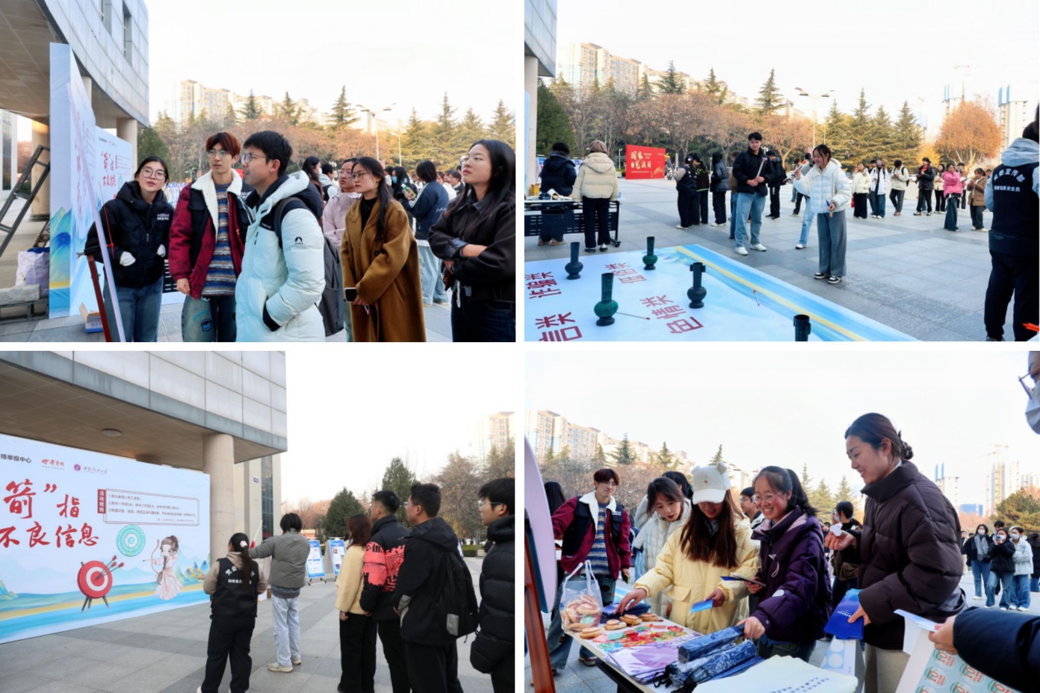 “同学,试试手气!转盘转到什么题,答对有奖!”在“转”识举报转盘答题环节,同学们纷纷转动大转盘,随机抽取并回答与网络举报相关的问题,在趣味互动中巩固了举报常识。投“诉”净网情景投壶挑战中,同学们根据听到的网络场景片段,快速判断信息类型,并将箭投入对应类别的壶中,有效锻炼了对不良信息的辨别能力。“这是谣言,该投‘虚假信息’壶!”“那条属于人身攻击,归‘网络暴力’类!”同学们迅速判断,手持箭矢瞄准对应壶口。这一“耳疾手快”的体验,让辨别不良信息的过程变得直观而有趣。“箭”指不良信息环节,同学们拉弓放箭,瞄准“打击”,在互动中强化了自觉抵制不良信息的意识。现场气氛热烈,顺利通关后的同学赢得了精美文创礼品,还收获了一份实用的网络举报指南。大家在参与中学习,在体验中收获,真正实现了“e”举多得,让青春力量在网络空间更加闪亮。