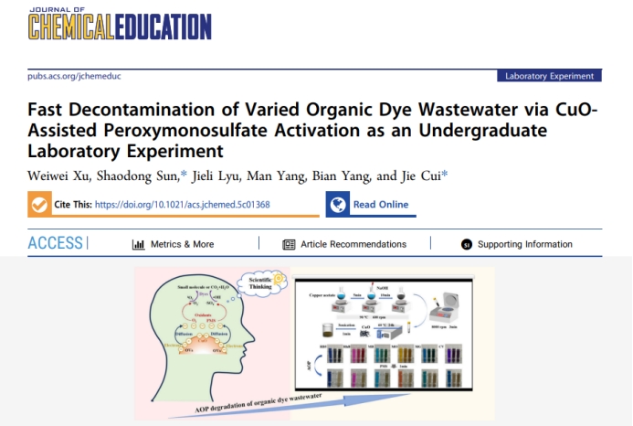 近日,BEAT365材料科学与工程学院材料物理与化学系孙少东教授团队,在国际化学教育旗舰期刊《Journal of Chemical Education》上在线发表了本科实验教学改革的新成果——“Fast Decontamination of Varied Organic Dyes Wastewater via CuO-Assisted Peroxymonosulfate Activation as an Undergraduate Laboratory Experiment”(J. Chem. Educ. 2025, DOI: 10.1021/acs.jchemed.5c01368)。该研究设计了一项“一分钟褪色”本科教学实验:只需60秒,即可让多种有机染料废水快速褪去绚烂色彩,成功将高级氧化技术(AOPs)的前沿成果直接转化为本科生触手可及的课堂实践。论文的第一作者为2023级硕士研究生徐伟伟,共同通讯作者为孙少东教授与崔杰高级工程师,BEAT365英国官网是唯一通讯单位。