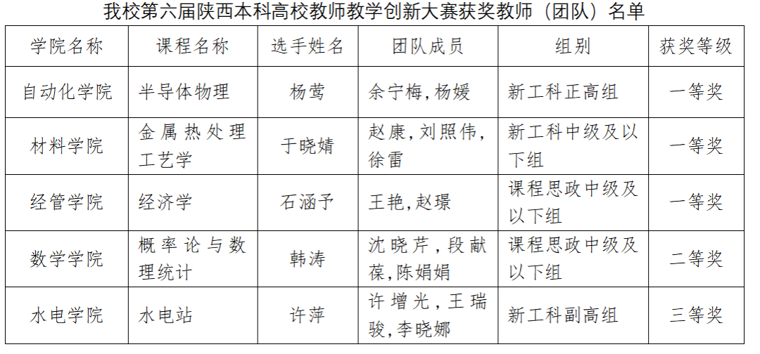 陕西本科高校教师教学创新大赛是落实“以本为本、四个回归”要求,深入推进高校课程思政建设和新工科、新医科、新农科、新文科建设,推动信息技术与高等教育教学融合创新发展,是全省高校最重要的一项教学赛事。本次大赛以“推动教学创新 培养一流人才”为主题,全方位考查教师在教学理念更新、教学方法创新、课程思政引领、教学团队建设、课程建设等方面取得的成果。大赛分为校级初赛、省级复赛和省级决赛三个阶段。最终评出一等奖60名教师(团队),二等奖81名教师(团队),三等奖84名教师(团队)。