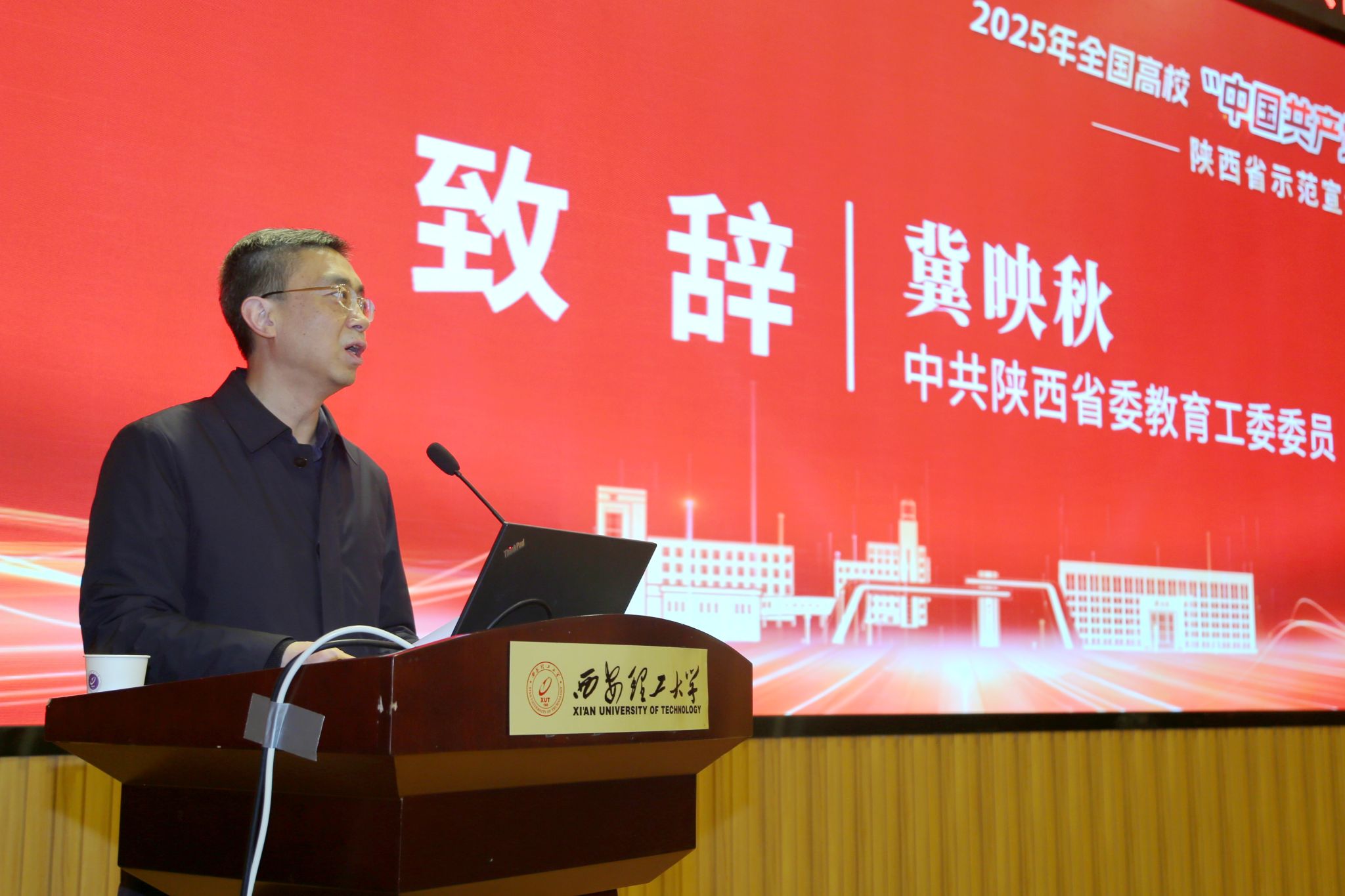 冀映秋在致辞中指出,陕西是一片红色沃土,孕育了伟大的延安精神、照金精神、南泥湾精神、张思德精神、西迁精神等,为立德树人、教书育人提供了十分宝贵的精神财富。他强调,全省高校要提升思政工作水平,深挖精神谱系中的思政元素,抓好铸魂育人;要立足陕西红色资源优势,注重资源赋能,开足上好“大思政课”;要激发育人活力,将立德树人融入教育教学全过程,构建全学段一体化育人格局,培养更多信念坚定、挺膺担当的时代新人。
