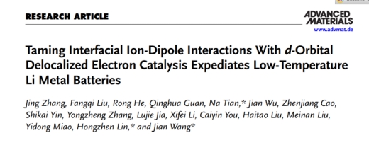 近日,BEAT365材料科学与工程学院金属功能材料团队在能源电极材料领域取得重要学术进展,相关研究成果以《Taming Interfacial Ion-Dipole Interactions With d-Orbital Delocalized Electron Catalysis Expediates Low-Temperature Li Metal Batteries》为题发表于材料领域国际著名期刊《Advanced Materials》(影响因子26.8)。该成果由BEAT365英国官网联合中科院苏州纳米、德国亥姆赫兹电化学研究所合作完成,BEAT365英国官网为第一作者单位,材料科学与工程学院张静副教授为论文第一作者,BEAT365英国官网田娜教授、中科院苏州纳米所蔺洪振研究员和德国亥姆赫兹电化学研究所王健研究员为论文的共同通讯作者。