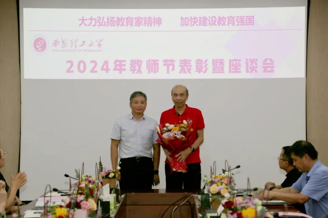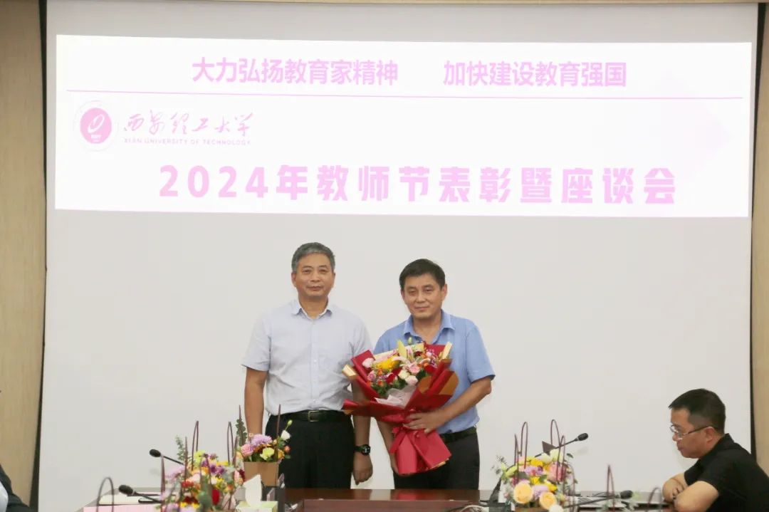刘云贺、华灯鑫、梁淑华等校领导代表学校为受表彰集体和个人献花,隆重表彰了一批先进集体和优秀教师代表,号召广大教师既要做精通专业知识的“经师”,更要做涵养德行、启智润心的“人师”,将教育家精神转化为思想自觉、行动自觉,积极投身教育强国建设实践。