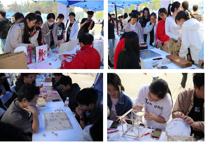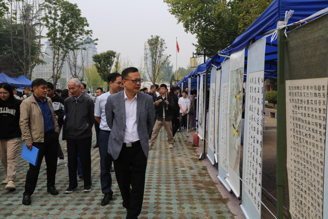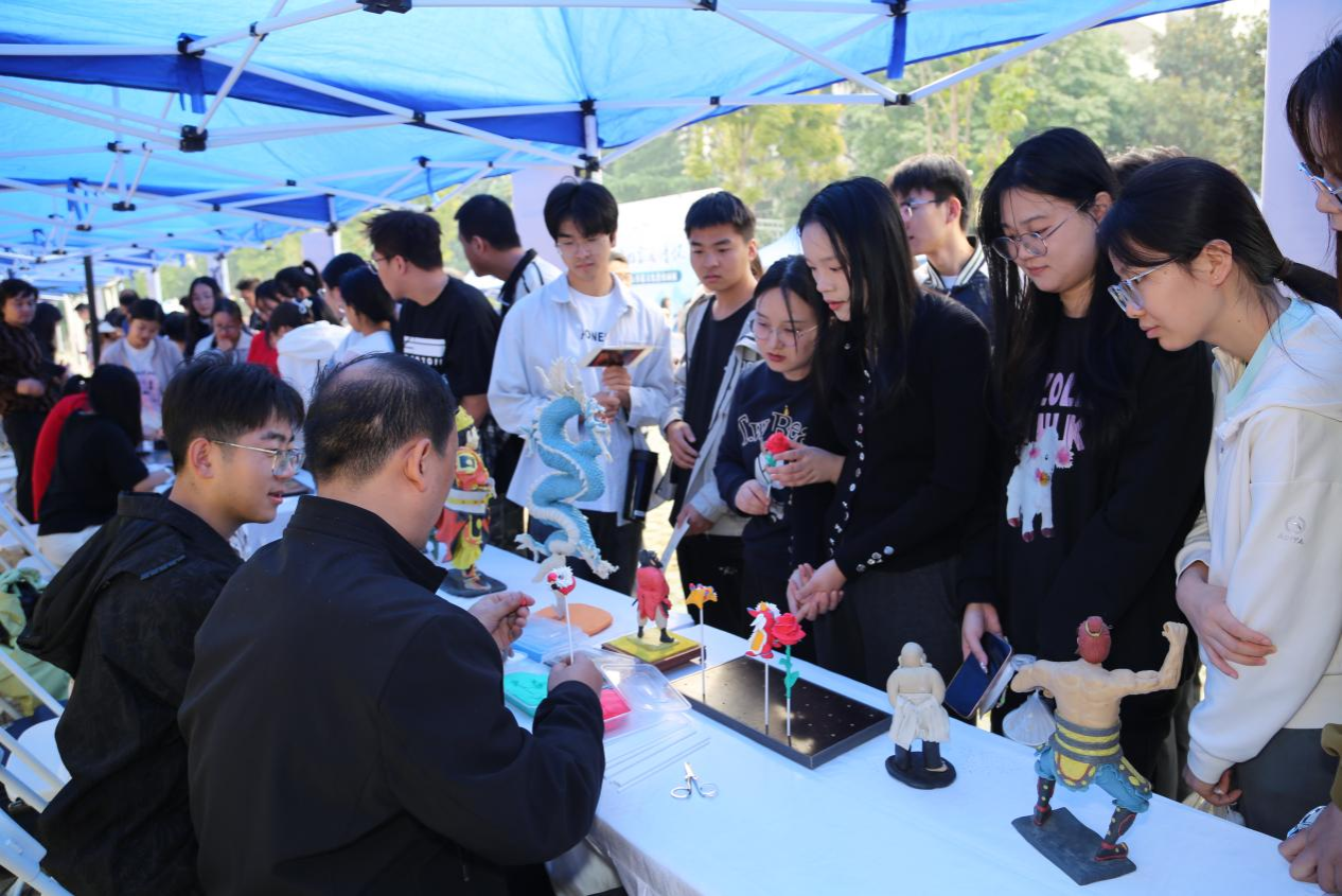 开幕式后,与会师生、嘉宾共同参观了位于学校明德广场的文化成果展。在非遗传承人展区中,六位非遗传承人分别展示了绣样剪纸、长安面塑技艺、糖画、鱼化泥叫叫、秦腔脸谱、非遗蛋雕等非遗手工艺品。在小山文化园展区、汉服体验区、书画展区、民乐区与文化互动区中,师生们从不同角度感受了中华优秀传统文化。在艺术展区,朱富帅老师和王二盟老师向师生们展示了雕塑文化和木作文化。