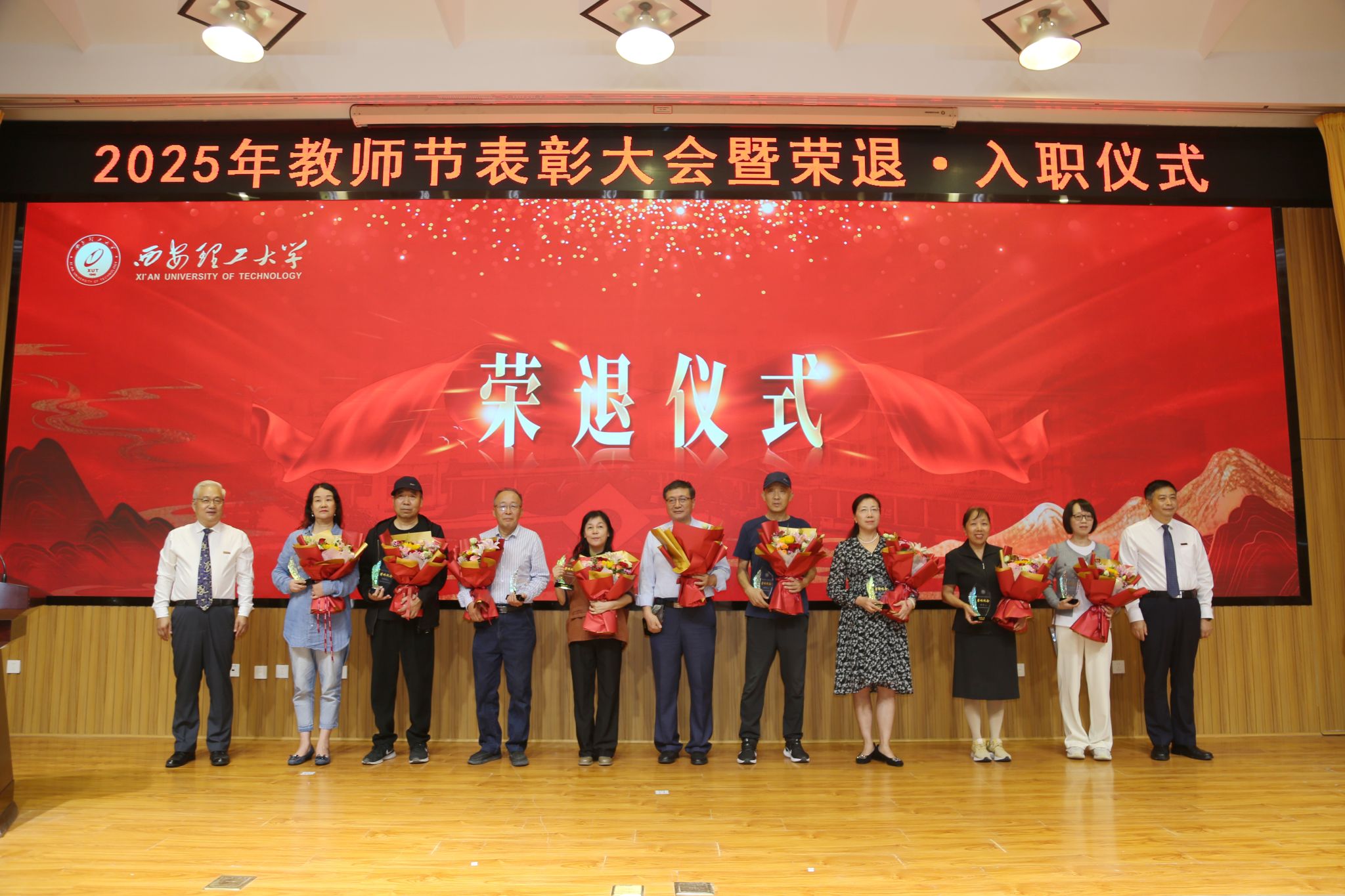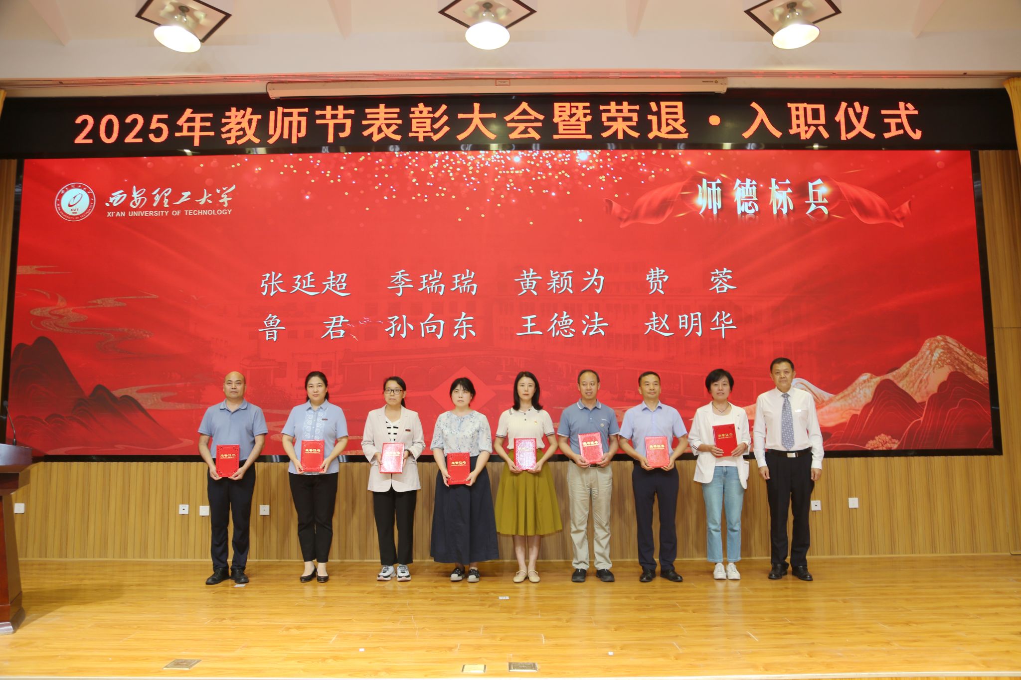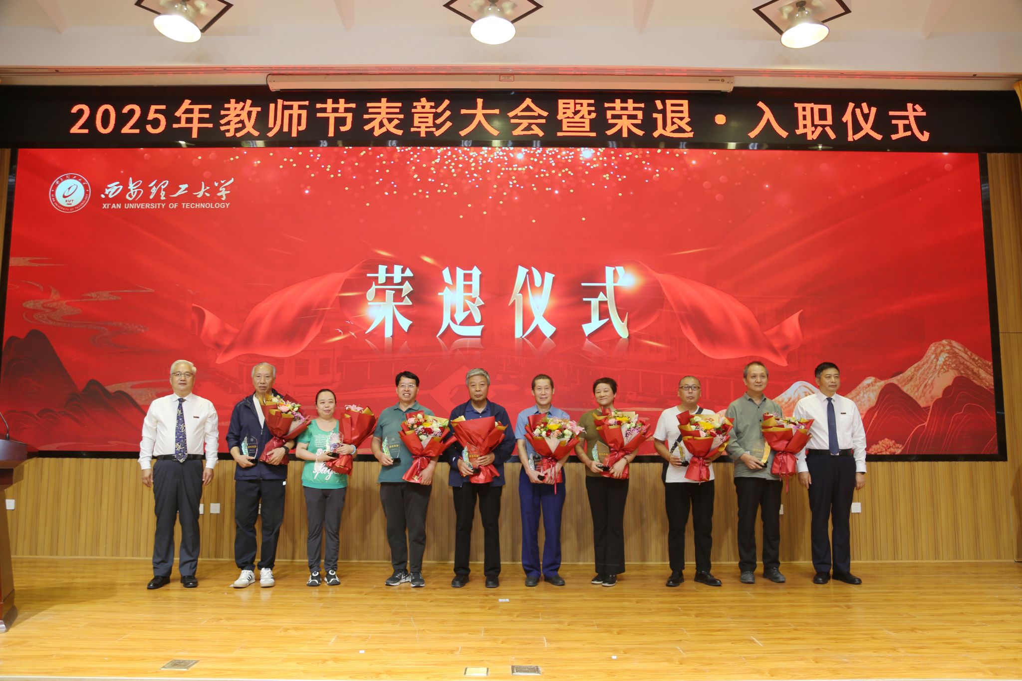 在校校领导,受表彰的师德先进集体和个人、荣退教职工代表、新入职教师、校属各单位负责人、科级干部和学生代表等300余人参加会议。