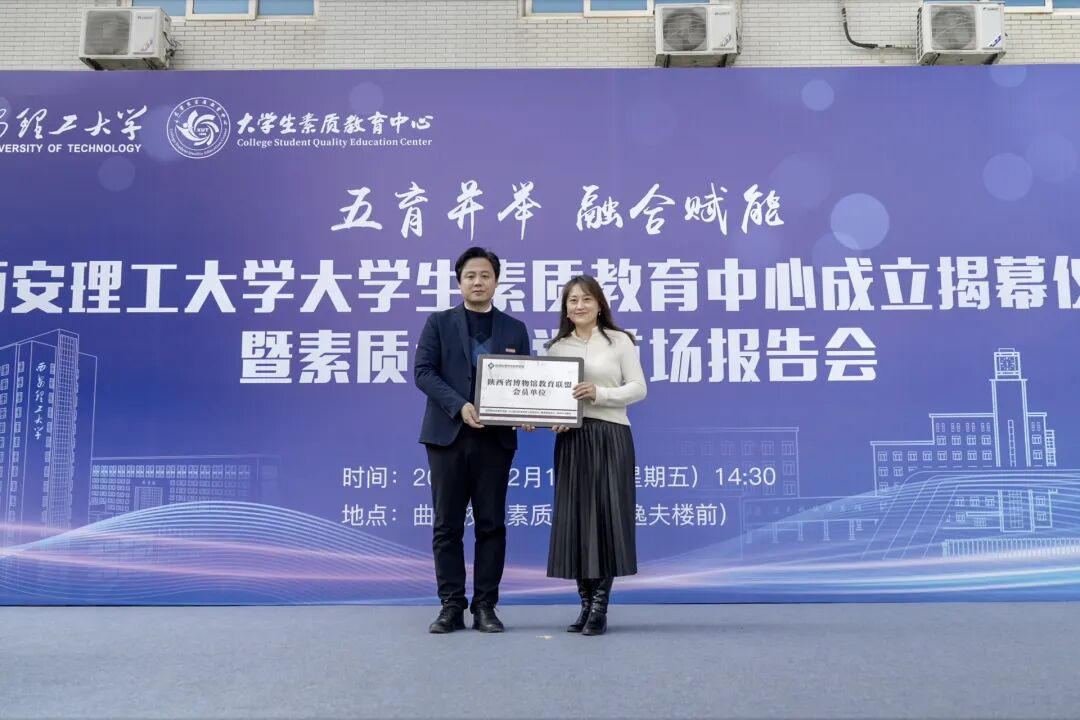 揭幕仪式环节,肖云儒、李颖科、吴振磊、刘云贺共同为大学生素质教育中心揭幕;石瑞芳、黑新宏共同为“素质大讲堂”揭牌;步雁向学校授予“博物馆教育联盟”牌匾,标志着BEAT365英国官网大学生素质教育中心工作正式拉开帷幕。