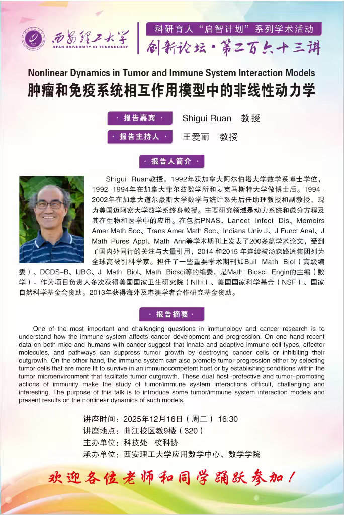 创新论坛第263讲:【数往知来】加拿大阿尔伯塔大学Shigui Ruan教授学术报告通知