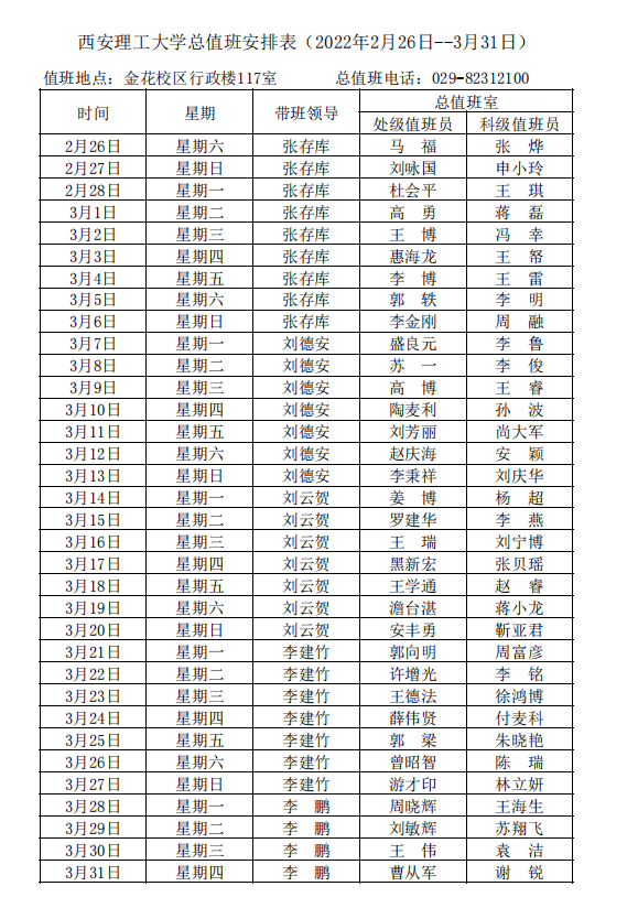 BEAT365英国官网总值班安排表(2022年2月26日——3月31日)