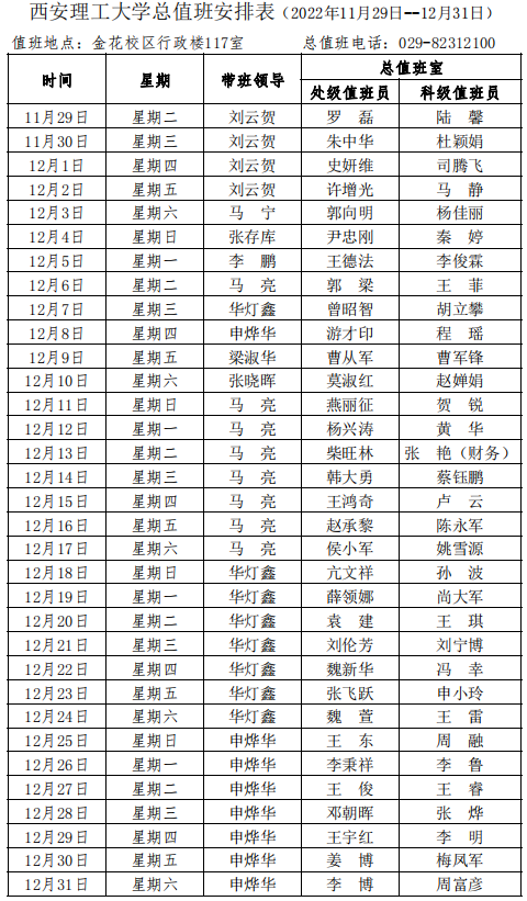 BEAT365英国官网总值班安排表(2022年11月29日——12月31日)