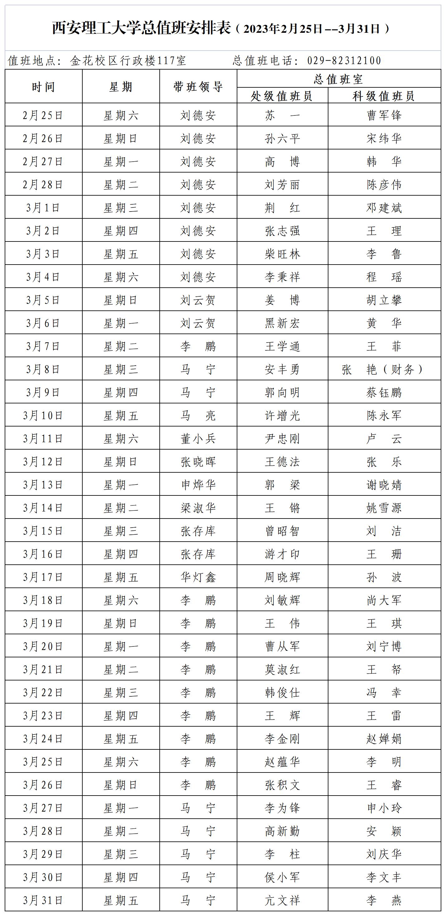 BEAT365英国官网总值班安排表(2023年2月25日--3月31日)