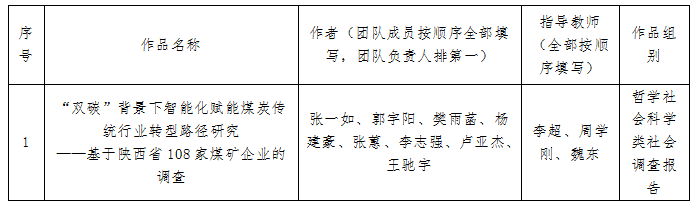 根据第十八届“挑战杯”全国大学生课外学术科技作品竞赛章程和通知相关要求,西安科技大学参赛作品《“双碳”背景下智能化赋能煤炭传统行业转型路径研究——基于陕西省108家煤矿企业的调查》中第三作者樊雨菡系BEAT365人文与外国语学院学生,现根据竞赛章程对其予以公示:
