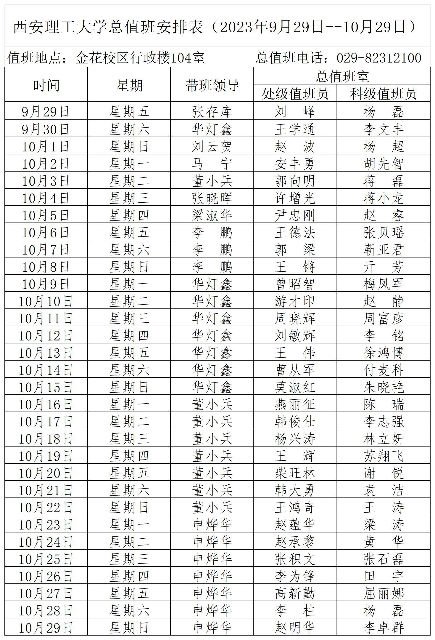 BEAT365英国官网总值班安排表(2023年9月29日--10月29日)