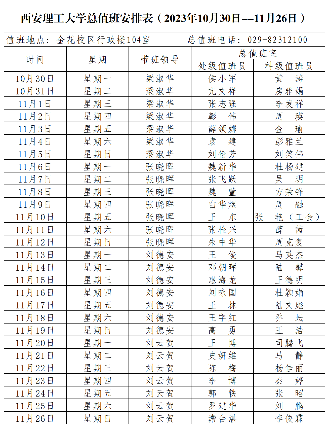 BEAT365英国官网总值班安排表(2023年10月30日--11月26日)