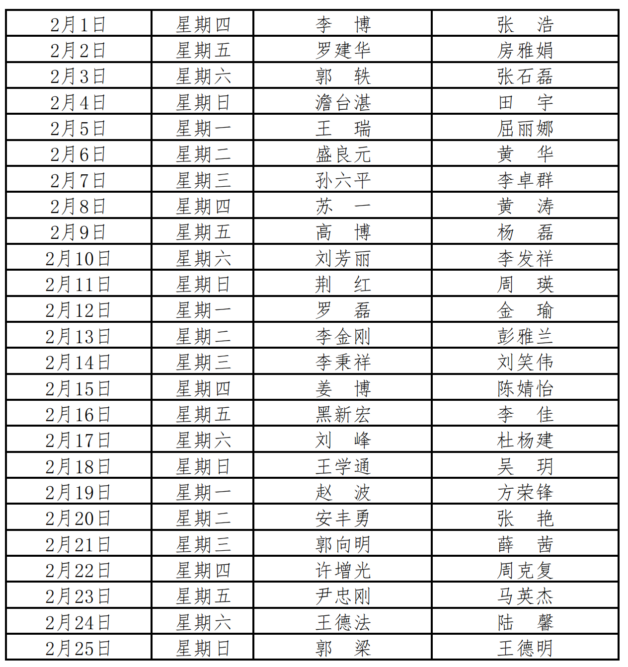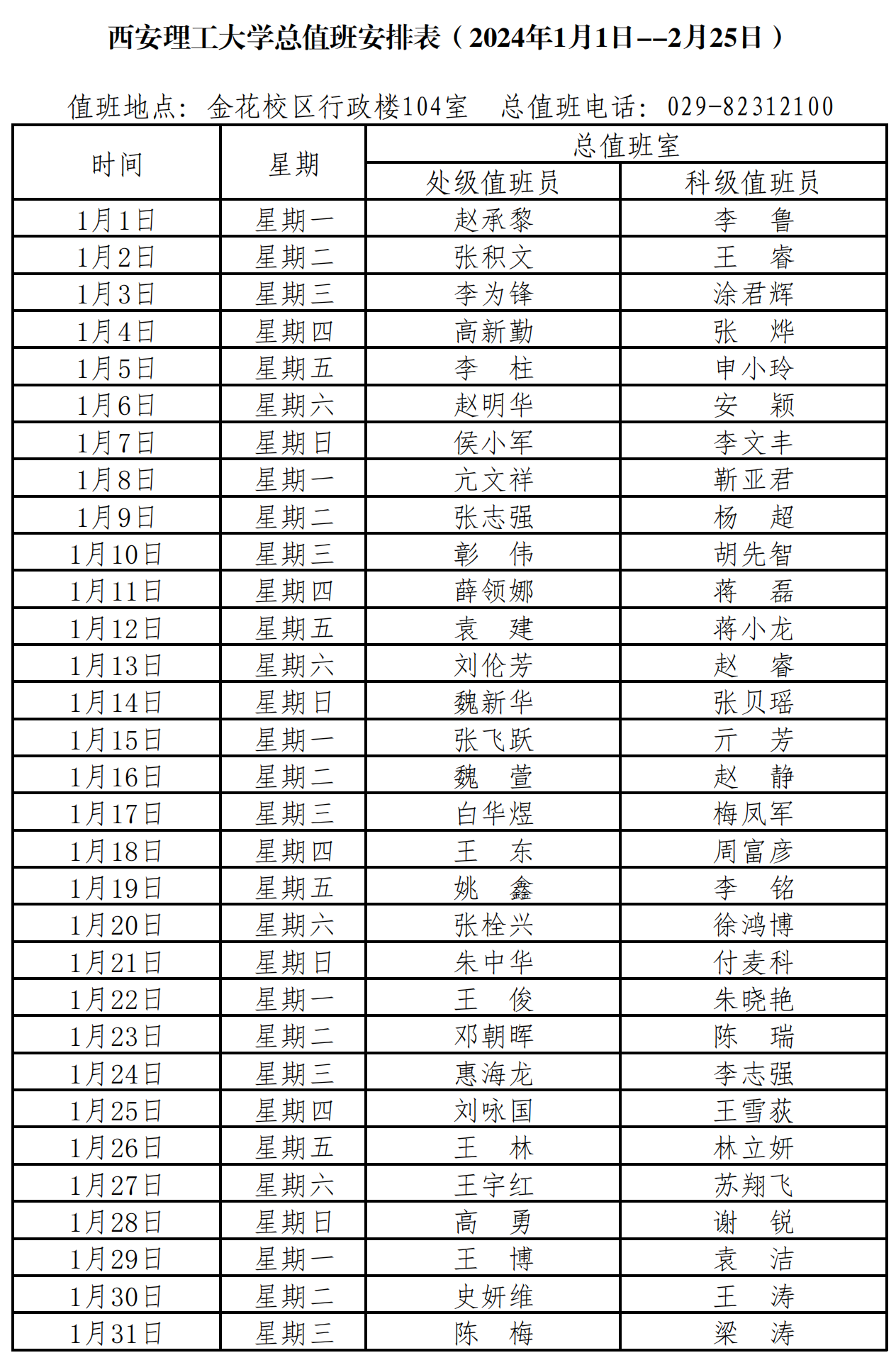 BEAT365英国官网总值班安排表(2024年1月1日--2月25日)