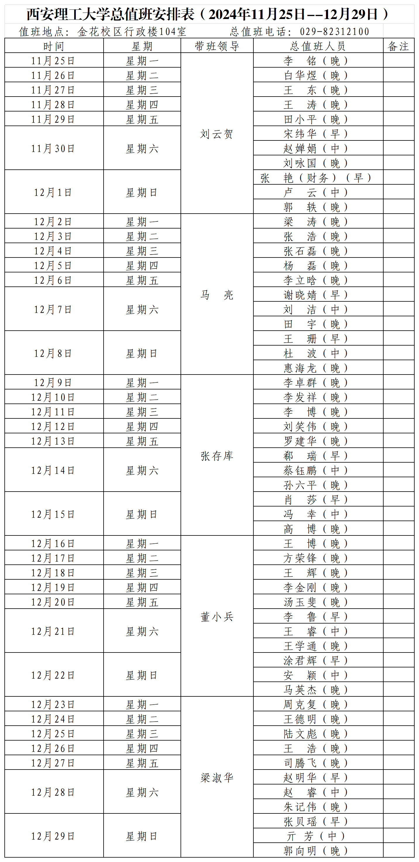 BEAT365英国官网总值班安排表(2024年11月25日--12月29日)