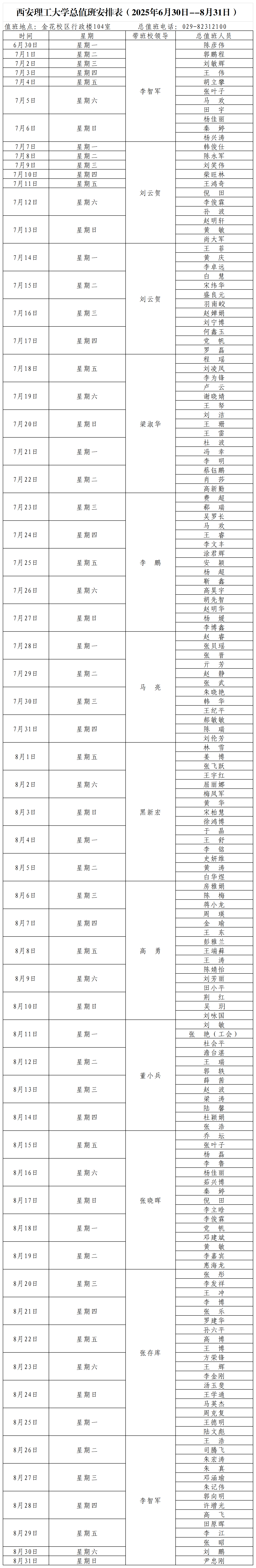 BEAT365英国官网总值班安排表(2025年6月30日--8月31日)