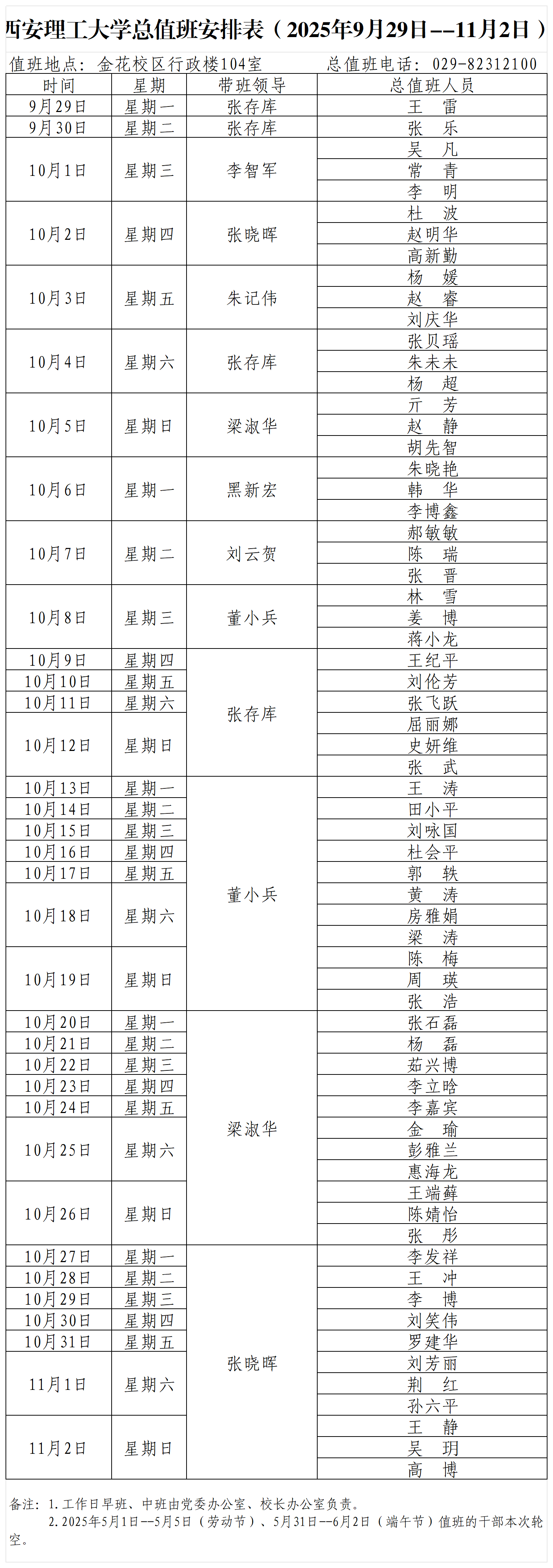 BEAT365英国官网总值班安排表(2025年9月29日--11月2日)