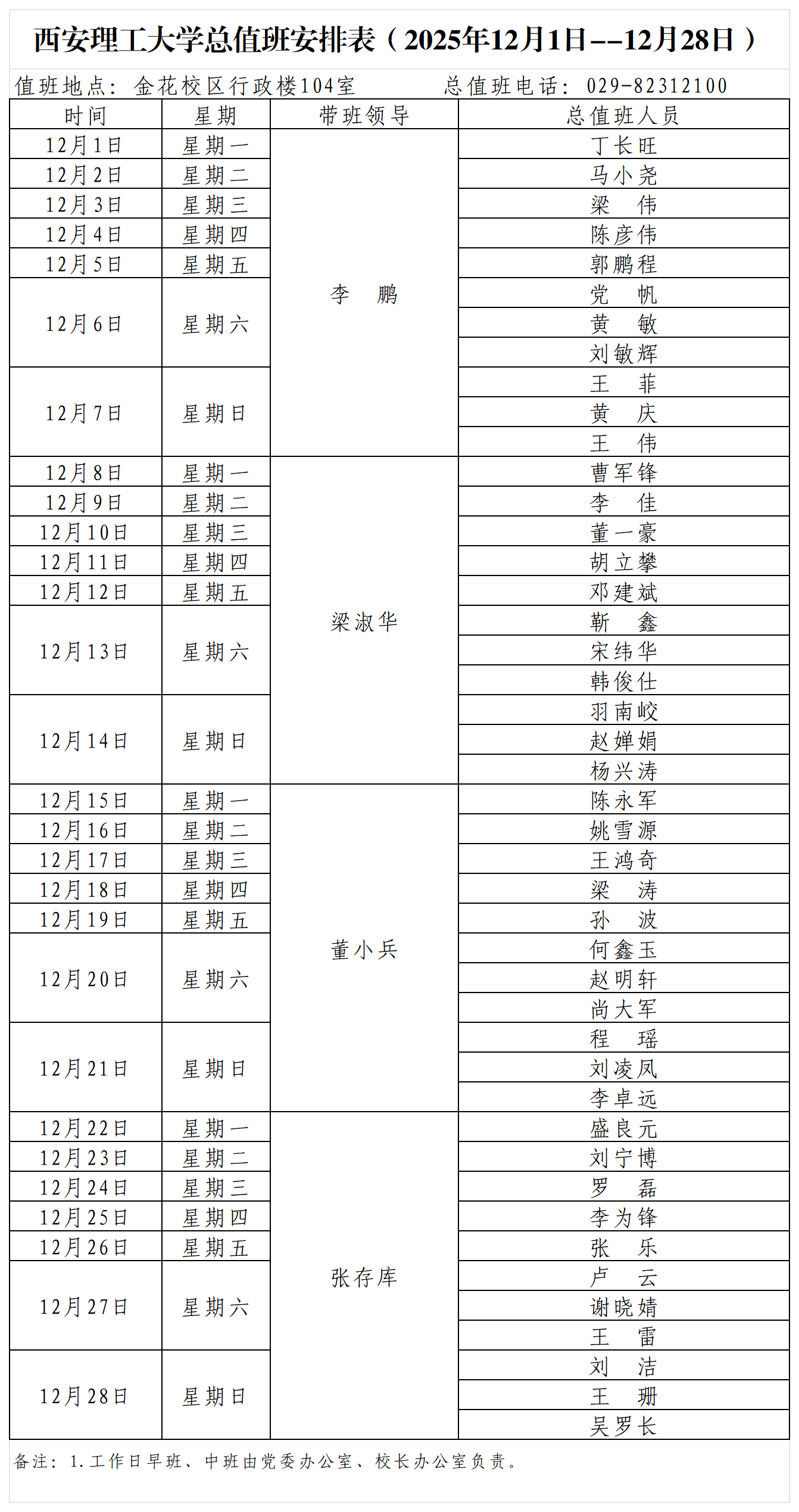 BEAT365英国官网总值班安排表(2025年12月1日--12月28日)