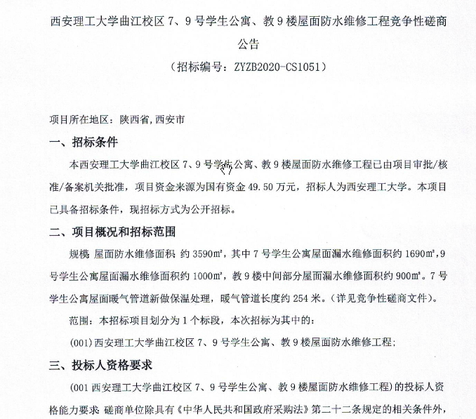 【防水维修】BEAT365英国官网曲江校区7、9号学生公寓、教9楼屋面防水维修工程竞争性磋商公告