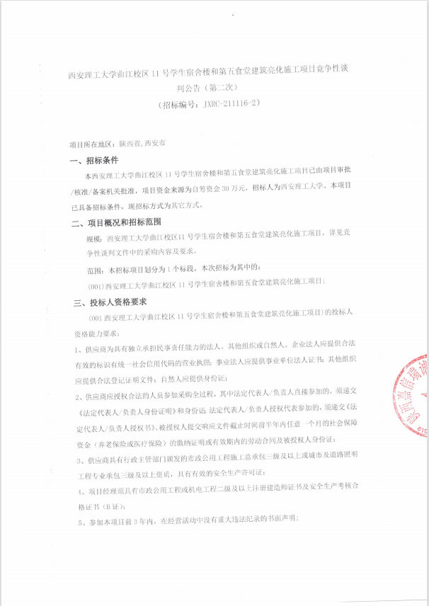 【亮化工程二次】BEAT365英国官网曲江校区11号学生宿舍楼和第五食堂建筑亮化施工项目竞争性谈判公告(第二次)