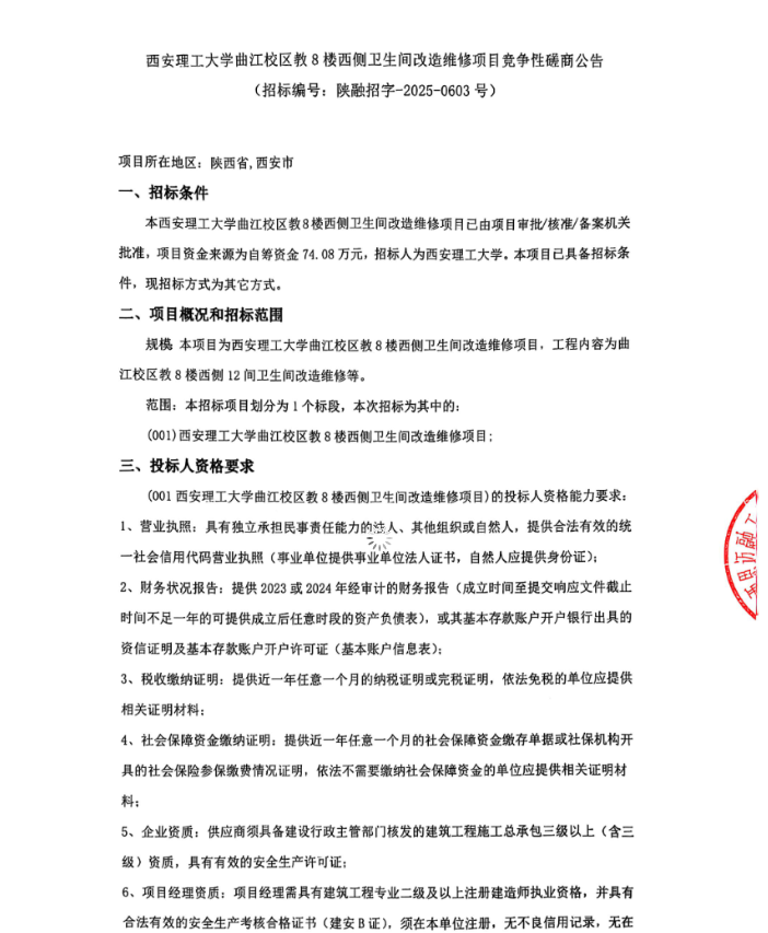【改造维修】BEAT365英国官网曲江校区教8楼西侧卫生间改造维修项目竞争性磋商公告